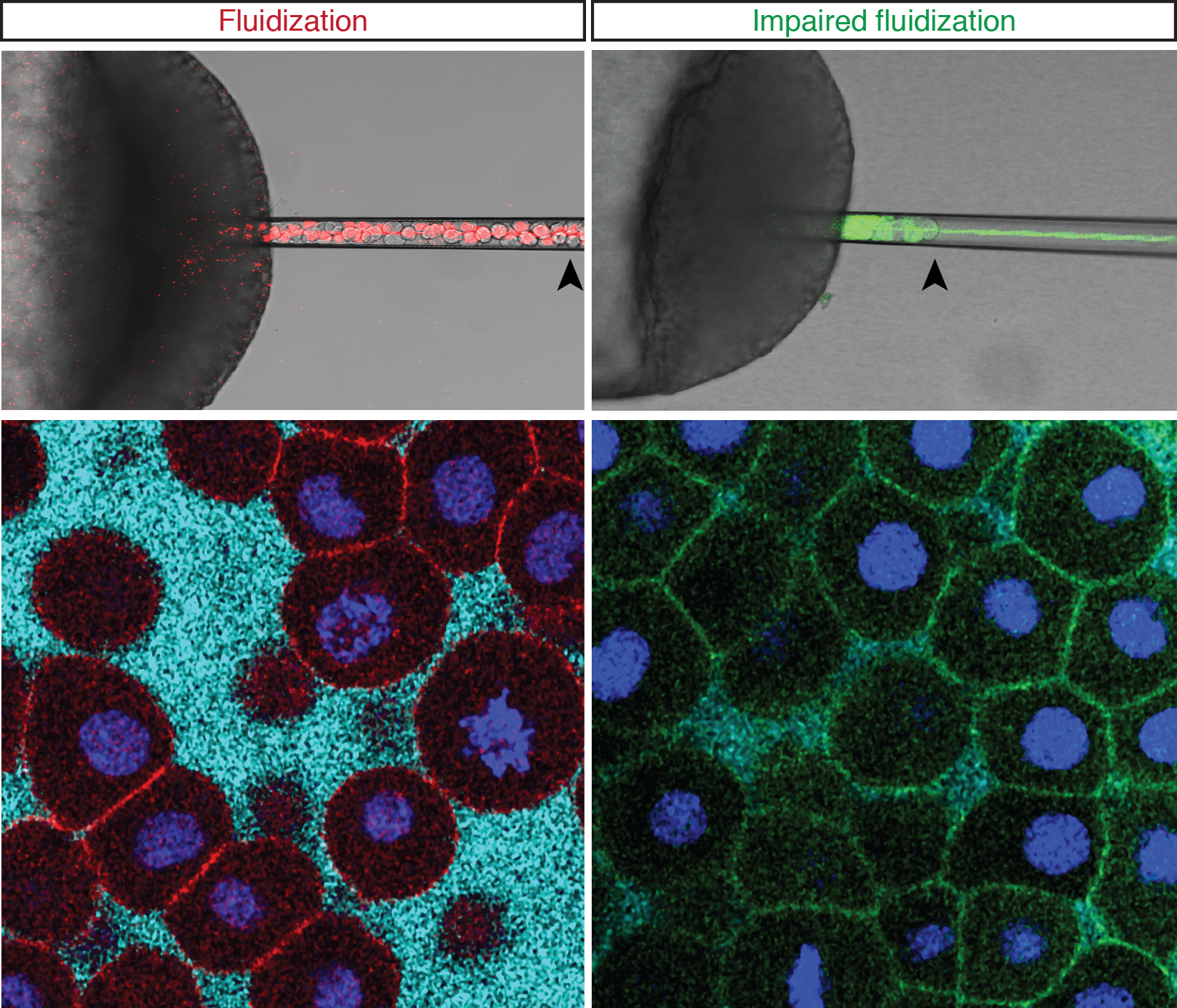 Zebrafische eignen sich besonders gut für die Untersuchung der Entwicklung von Tieren, da ihre Embryonen transparent sind und sich außerhalb der Mutter entwickeln. Zu Beginn der Zebrafisch-Entwicklung breitet sich eine Gewebeschicht, das so genannte Blastoderm, über das Dotter aus. Das Blastoderm ändert dabei seine Form und bildet eine Kuppel, daher wird dieser Prozess als "Doming" bezeichnet (abgeleitet vom Englischen „dome“ für Kuppel). In der vorliegenden Studie untersuchten Petridou et al. die mechanischen Kräfte, die während dieser Formänderung wirken. Indem sie durch eine Pipette Druck auf das embryonale Gewebe ausübten und maßen, wie schnell es sich verformt, konnten die Forscher ableiten, wie viskos oder flüssig das Gewebe ist: Gewebe, das sich langsam verformt, ist viskoser als Gewebe, das sich schnell verformt. Tests zu mehreren Zeitpunkten in verschiedenen Regionen des sich entwickelnden Embryos zeigten, dass das Gewebe während des Doming zu einem sehr bestimmten Zeitpunkt und nur in einer Geweberegion plötzlich flüssig wird. „Ein solcher Fluiditätsübergang wurde von Theorie und Modellen vorhergesagt, aber hier zeigen wir zum ersten Mal, dass er in einem echten, lebenden Organismus stattfindet", sagt Erstautorin Nicoletta Petridou.