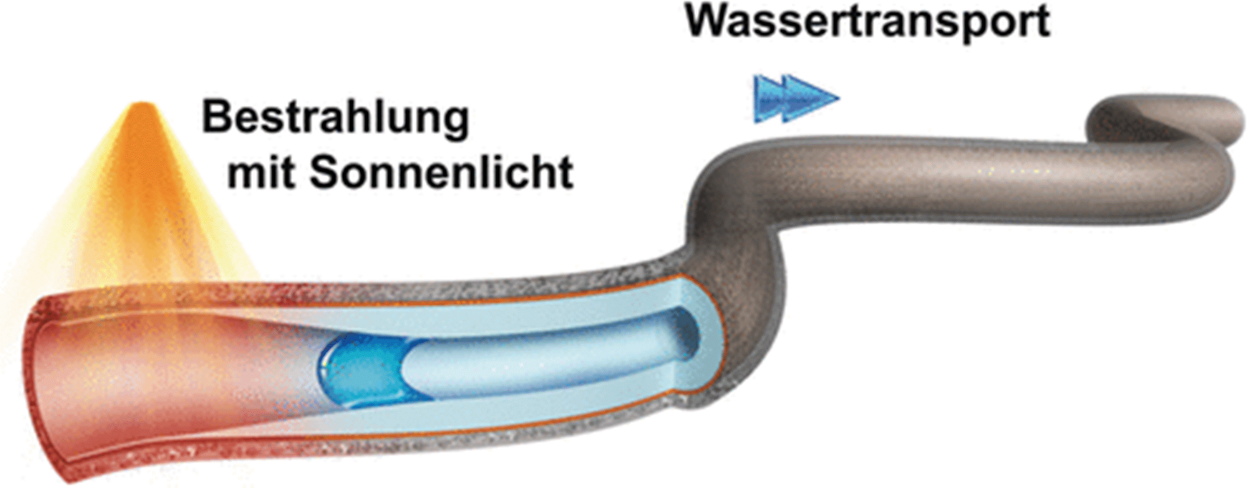 Die Pumpe besteht aus einem Polymerschlauch von ca. 500 µm Durchmesser, der aus zwei Schichten aufgebaut ist. Die äußere besteht aus Polydimethylsiloxan (PDMS), dem die Forscher um Chun Li, Zhiping Xu und Liangti Qu reduziertes Graphenoxid (rGO) beimischten, ein Kohlenstoff-basiertes Nanomaterial, das das Spektrum des Sonnenlichts besonders gut absorbiert und dabei stark erhitzt wird. Die Wärme wird auch auf die innere Beschichtung der Schlauchwand übertragen. Sie besteht aus Poly-N-Isopropylacrylamid (PNIPAm), einem Polymer, das bei Raumtemperatur ein Hydrogel bildet: Die Polymerketten sind dann zu einem Netzwerk verknäuelt, das durch Einlagerung von Wasser aufgequollen ist. Ab etwa 32 °C kollabiert das Hydrogel zu kompakten Kügelchen, die die Innenwand wasserabweisend machen. Zudem schrumpft die innere Schicht, sodass der Innendurchmesser des Schlauches größer wird.