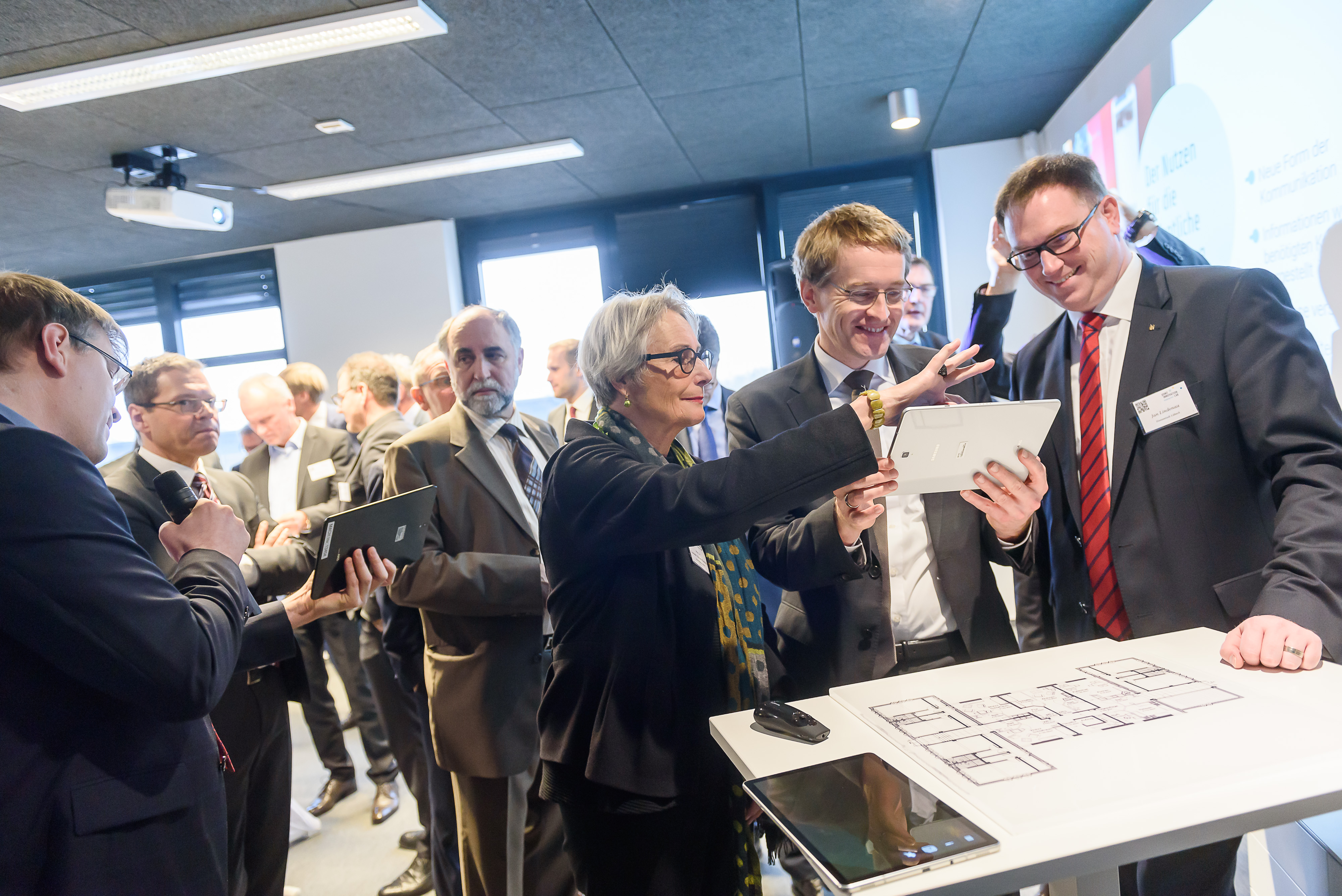 Insgesamt versammelten sich rund 70 Entscheider aus Verwaltung, Wirtschaft und Politik zur Eröffnung des Labs im Multifunktionscenter MFC X in der Maria-Goeppert-Straße. Sie besichtigten die neuen Räume, informierten sich über erste gemeinsame Projekte und nahmen an Workshops teil. Präsentiert wurden dabei auch erste Forschungsthemen, die MACH bereits mit dem Institut für Multimediale und Interaktive Systeme (IMIS) der Universität zu Lübeck bearbeitete – so zum Beispiel der Einsatz von Augmented Reality bei der Bearbeitung von Bauanträgen und die Verknüpfung mit einer digitalen Bauakte, um Bearbeitungszeiten zu verkürzen.