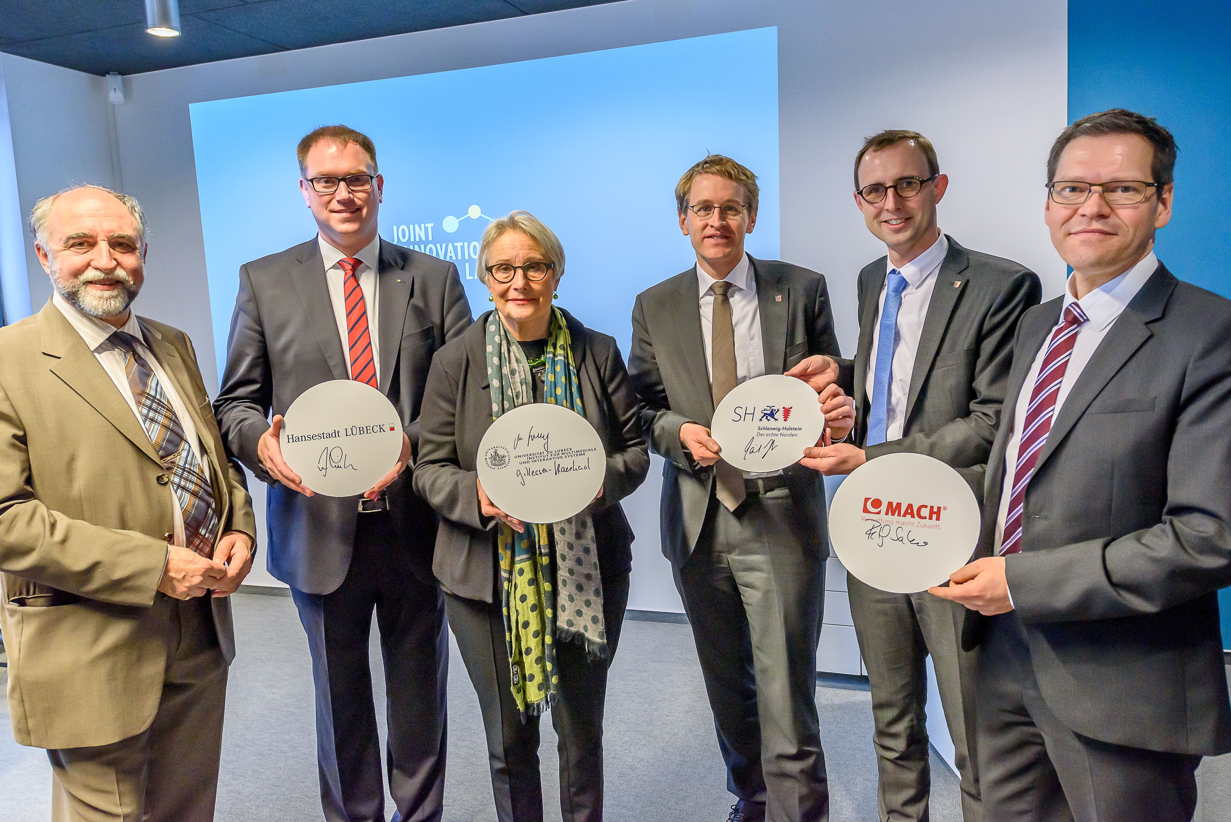 Im Anschluss an die offizielle Eröffnungszeremonie unterzeichneten auf einer Project Wall für die Universität zu Lübeck deren Präsidentin, Prof. Dr. Gabriele Gillessen-Kaesbach, und Prof. Herczeg neben dem Ministerpräsidenten und Vorstandsvorsitzendem Rolf Sahre. Für eine Überraschung sorgte Lübecks Bürgermeister Jan Lindenau, der noch während der Eröffnung eine Absichtserklärung unterzeichnete und damit die Basis für eine Projektpartnerschaft mit der Universität zu Lübeck und der MACH AG im Joint Innovation Lab legte.