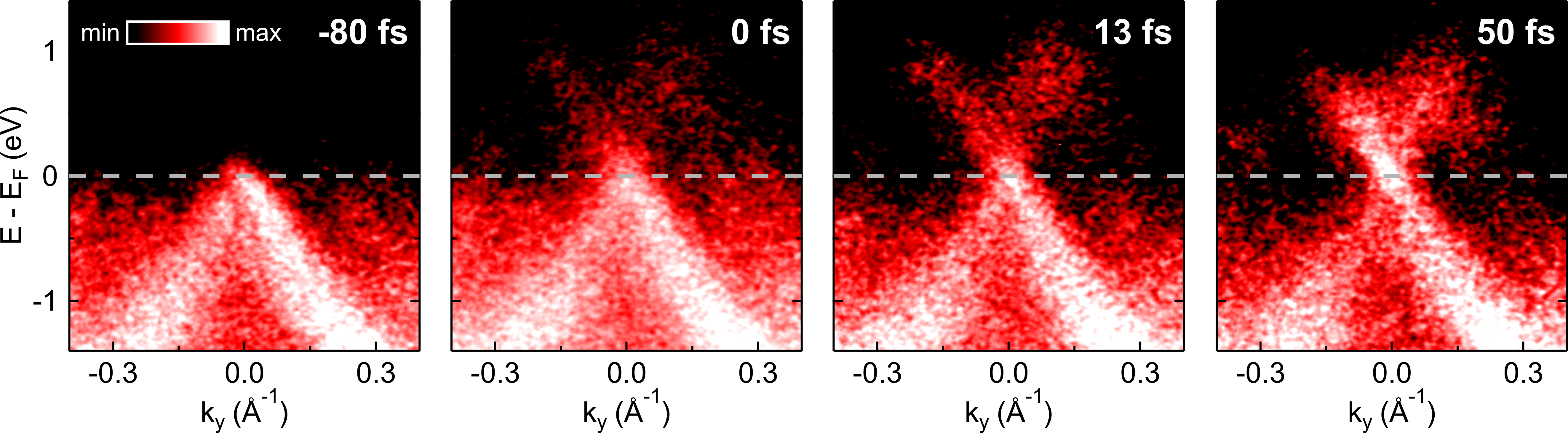 Bildunterschrift: Filmaufnahmen zeigen erstmals, wie sich die Energieverteilung in einer Graphitprobe über den ultrakurzen Zeitraum von 50 Femtosekunden verändert.