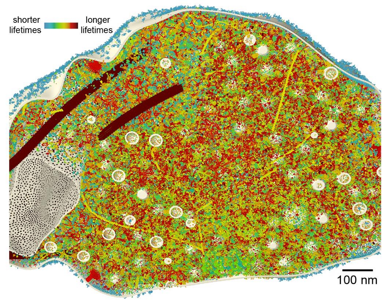 BILDUNTERSCHRIFT: Das 3D-Modell eines synaptischen Endköpfchens zeigt im Anschnitt die Proteine in ihrer entsprechenden Kopienzahl in der Synapse. Die farbliche Darstellung verdeutlicht die unterschiedlichen Lebenszeiten der Proteine (rot: langlebiger; blau: kurzlebig). Abb.: cnmpb/rizzoli