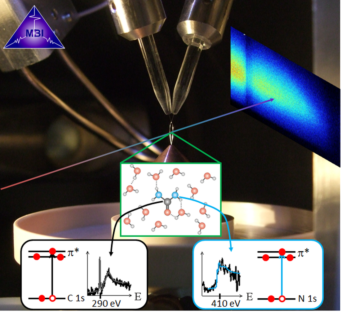 Die Röntgenspektroskopie bietet einen direkten Einblick in die Natur chemischer Bindungen und den Verlauf chemischer Reaktionen. Momentan werden von wichtigen Forschungslaboren intensive Anstrengungen bei der Weiterentwicklung der Röntgenquellen und der Implementierung neuer Messmethoden unternommen. Forscher am MBI haben nun erfolgreich Absorptionsspektroskopie im sog. Wasserfenster demonstriert, indem sie eine laserbasierte Strahlungsquelle von ultrakurzen Röntgenimpulsen mit einer neuartigen Technologie zur Erzeugung eines Dünnschicht-Flüssigkeitsstrahls kombinierten. Damit wird erstmals die gleichzeitige Untersuchung von Kohlenstoff (C) und Stickstoff (N) in organischen Molekülen in wässriger Lösung ermöglicht.