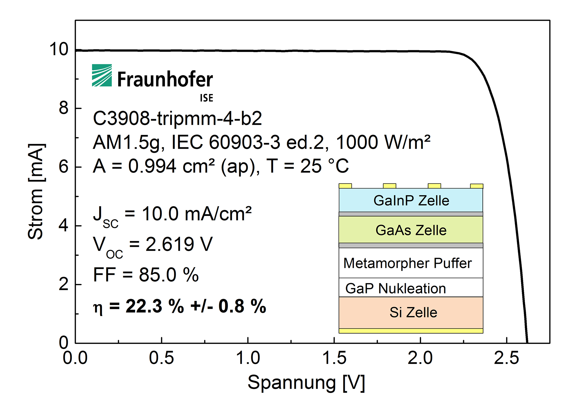 Siliciumsolarzellen dominieren heute den Photovoltaikmarkt aber die Technologie nähert sich dem theoretisch maximalen Wirkungsgrad an, der mit Silicium als alleinigem Absorbermaterial erreicht werden kann. Tandemsolarzellen ermöglichen durch die Kombination von mehreren Absorbermaterialien eine deutlich bessere energetische Nutzung des Sonnenspektrums. Aufgrund des höheren Wirkungsgradpotenzials könnten sie die Basis der künftigen Solarzellengeneration sein. Auf der Grundlage intensiver Materialforschung haben Wissenschaftler am Fraunhofer ISE, gemeinsam mit Partnern, einen neuen Wirkungsgradrekord von 22,3 Prozent für eine Mehrfachsolarzelle aus Silicium und III-V-Halbleitern erzielt.