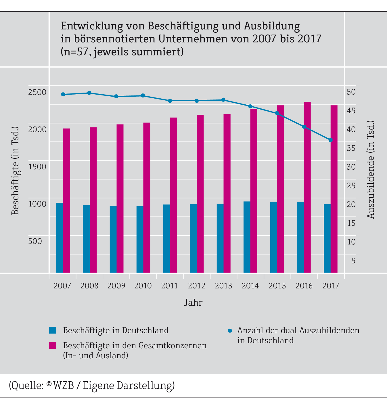 Im Jahr 2017 hatten die 195 größten börsennotierten Unternehmen in Deutschland zusammen 6,2 Millionen Beschäftigte weltweit und ca. 125.000 duale Auszubildende in Deutschland. Bundesweit gab es in diesem Jahr etwa 1,3 Millionen Auszubildende.