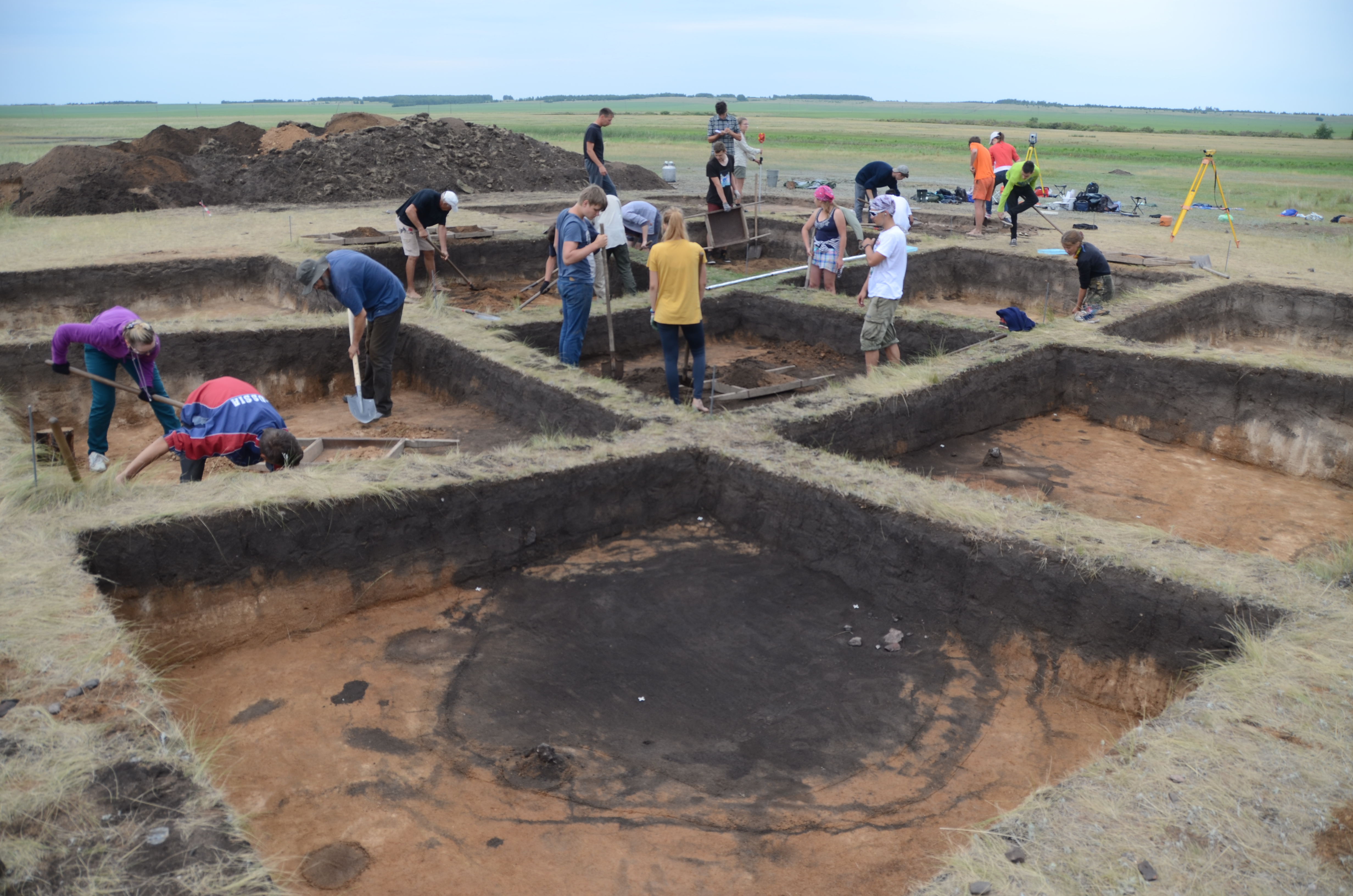 01 Trans-Ural region. Konopljanka-2 Bronze Age terraced house settlement with a filled-in well shaft in the foreground. 2018 excavation. © Ural Project, Goethe University