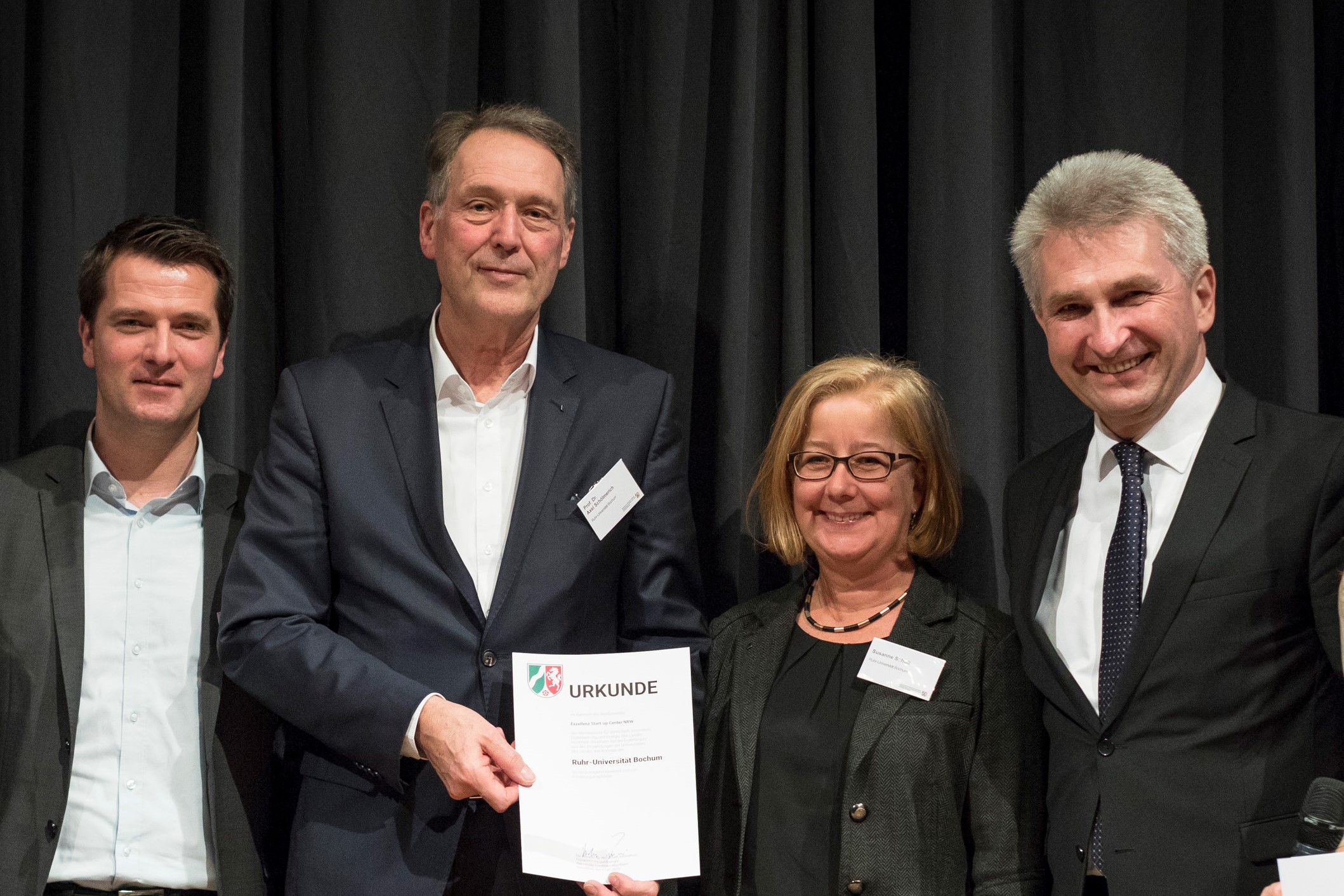 Der Rektor hat die Auszeichnung im Wettbewerb der Universitätsstandorte Nordrhein-Westfalens am 17. Januar 2019 in Düsseldorf von Wirtschaftsminister Prof. Dr. Andreas Pinkwart erhalten. Das Land hat insgesamt sechs Anträge auf Förderung mit einem Gesamtvolumen von 150 Millionen Euro ausgewählt. Am Vormittag war ein dreiköpfiges Team ins NRW-Wirtschaftsministerium gereist, um die Jury von den Bochumer Plänen zu überzeugen. Gemeinsam mit Marc Seelbach, Leiter Transfer und Entrepreneurship der RUB, und Ralf Meyer, Geschäftsführer der Bochum Wirtschaftsentwicklung, stellte Prorektor Prof. Dr. Andreas Ostendorf die Idee des Bochumer Exzellenz-Start-up-Centers vor. Am Abend schon wurde die RUB als einer der Gewinner des Wettbewerbs gekürt.