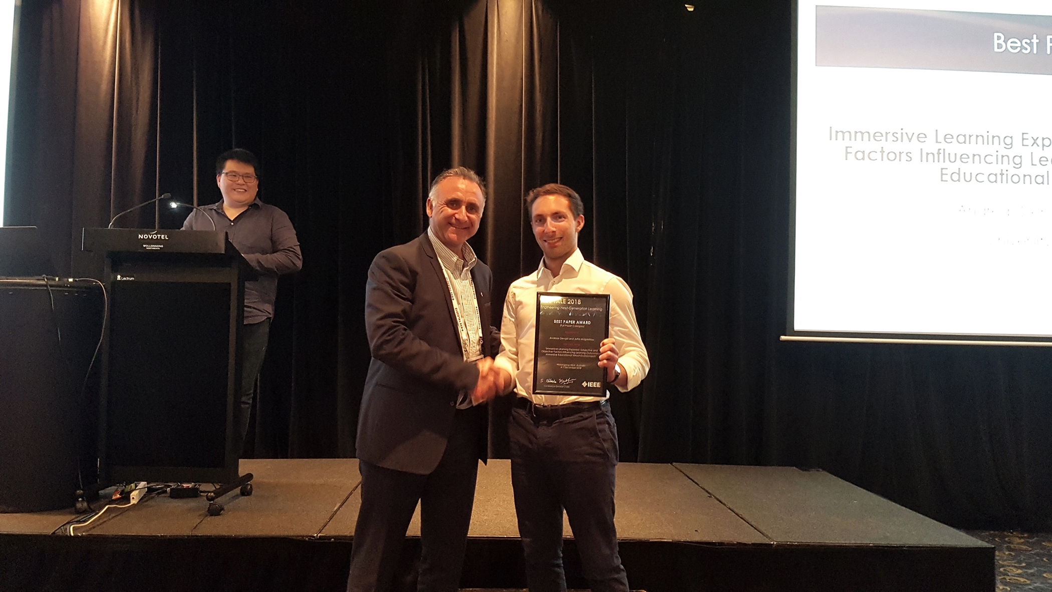 Doctoral student and Graduate Research Assistant Andreas Dengel of the University of Passau was honoured with the ‘Best Paper Award’ at the IEEE TALE 2018 in Wollongong, Australia, for one of his submissions. The winning paper ‘Immersive Learning Explored: Subjective and Objective Factors Influencing Learning Outcomes in Immersive Educational Virtual Environments’ emerged from collaboration with Professor Jutta Mägdefrau, who holds the Chair of Educational Sciences with a focus on Empirical Research on Teaching and Learning at the University of Passau.