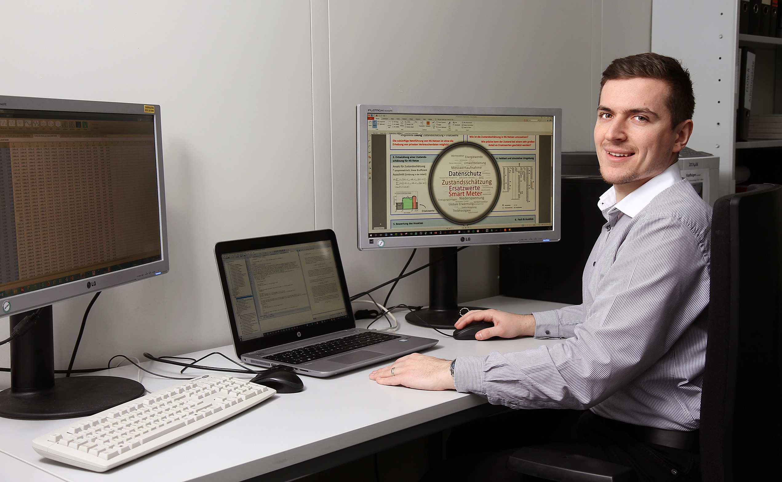 Seine Rechenverfahren hat er am Lehrstuhl auf dem Campus in verschiedenen Computersimulationen unter die Lupe genommen. „Wir haben einige Modelle von Niederstromnetzen für Städte und ländliche Regionen“, sagt der Ingenieur. „Mit ihnen haben wir getestet und gesehen, dass die Methode funktioniert.“ Darüber hinaus hat Brandalik die Algorithmen bei einem Netzbetreiber geprüft. „Die Überwachung des Stromnetzes ist präzise genug und so für den Netzbetrieb vertretbar“, fasst er die Ergebnisse kurz zusammen. „Private Daten werden dabei nicht erhoben.“ Sollte es beispielsweise plötzlich zu starken Schwankungen, einem Leistungsabfall oder -anstieg im Netz kommen, wird dies erkannt, die Ergebnisse liefern aber keine präzisen Angaben über das Verbraucherverhalten.