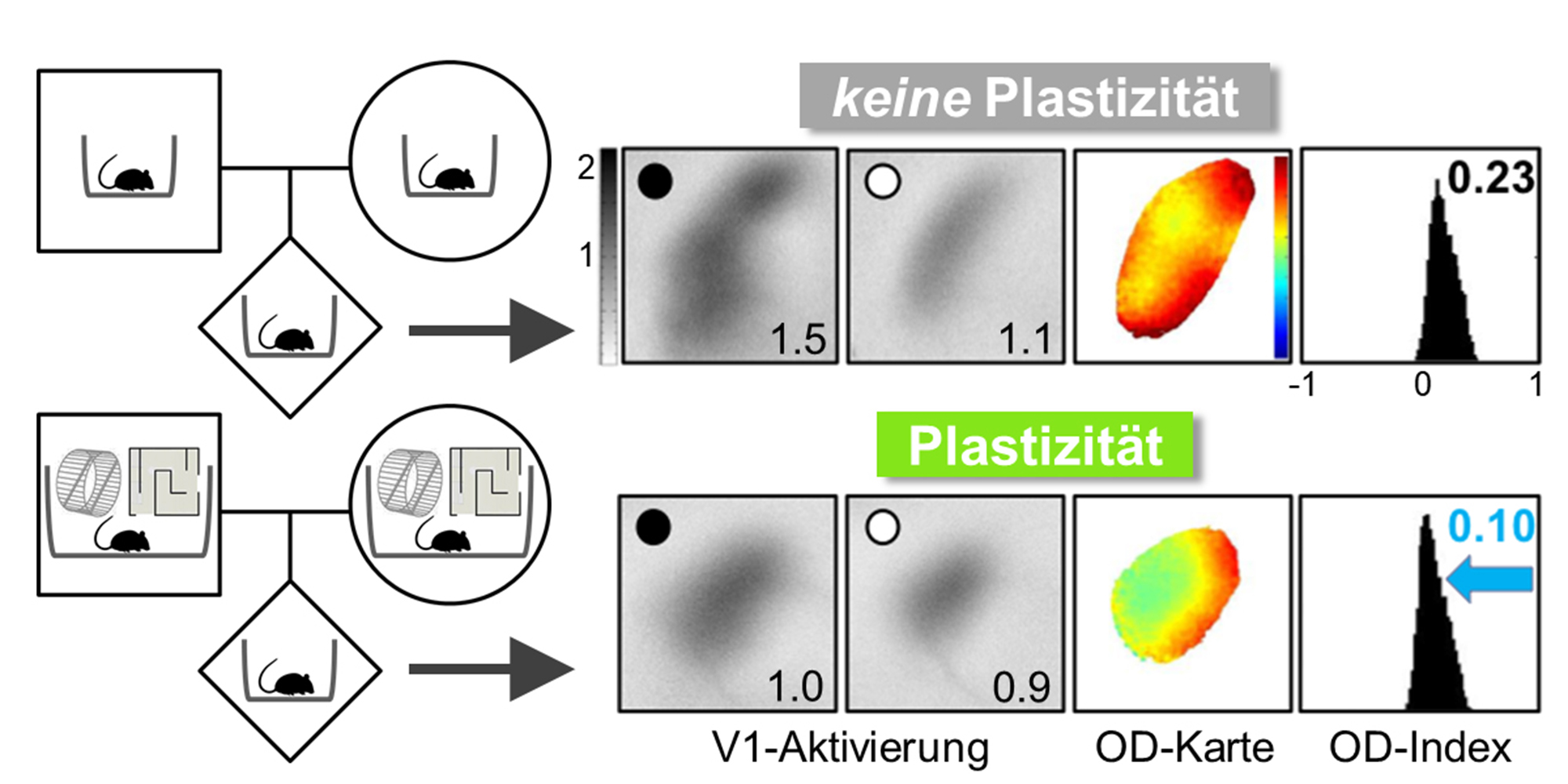 „Mäuse, die in dieser stimulierenden Umwelt aufwuchsen, zeigten eine hohe Plastizität in der Sehrinde, sogar bis ins späte Erwachsenenalter“, sagt Abteilungsleiterin Prof. Dr. Siegrid Löwel. Nachdem die Mauseltern sich in den großen Käfigen verpaart hatten, wurden die trächtigen Mausmütter in sogenannte Standardkäfige gesetzt, viel kleinere Käfige ohne Laufräder und Labyrinthe, und die Plastizität der Nachkommen im Erwachsenenalter untersucht. Die neuen Befunde zeigen nun, dass eine stimulierende Umwelt den Zeitraum jugendlicher Anpassungsfähigkeit im Gehirn nicht nur bei den Mauseltern verlängert, sondern auch bei ihren Nachkommen, die selbst in einer weniger stimulierenden Umwelt aufwuchsen. Löwel ergänzt: „Zusätzlich scheint die Mausmutter hierbei den größeren Einfluss auf die Anpassungsfähigkeit der Sehrinde der Nachkommen zu haben. Die neuronale Plastizität der Hirnrinde wird somit nicht nur durch die eigenen Lebenserfahrungen bestimmt, sondern kann auch durch die Lebensumwelt der Eltern maßgeblich verändert werden.“