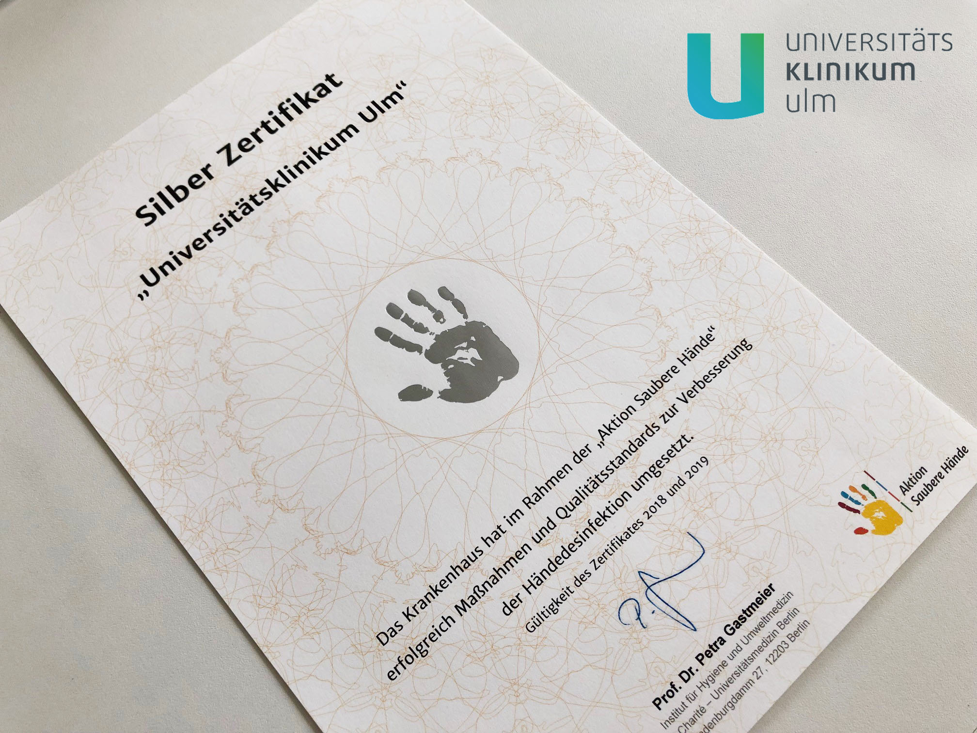 Patientensicherheit im Fokus: Für konsequent eingehaltene Maßnahmen zur Händehygiene ist das Universitätsklinikum Ulm Ende Dezember mit dem Silber-Zertifikat der bundesweiten „Aktion Saubere Hände“ ausgezeichnet worden. Es bestätigt die erfolgreiche kontinuierliche Umsetzung der Qualitätsanforderungen sowie das hohe Niveau der Maßnahmen zur Prävention von Krankenhausinfektionen. Nicht einmal ein Jahr ist es her, seit das Uniklinikum sich über Bronze freuen konnte.