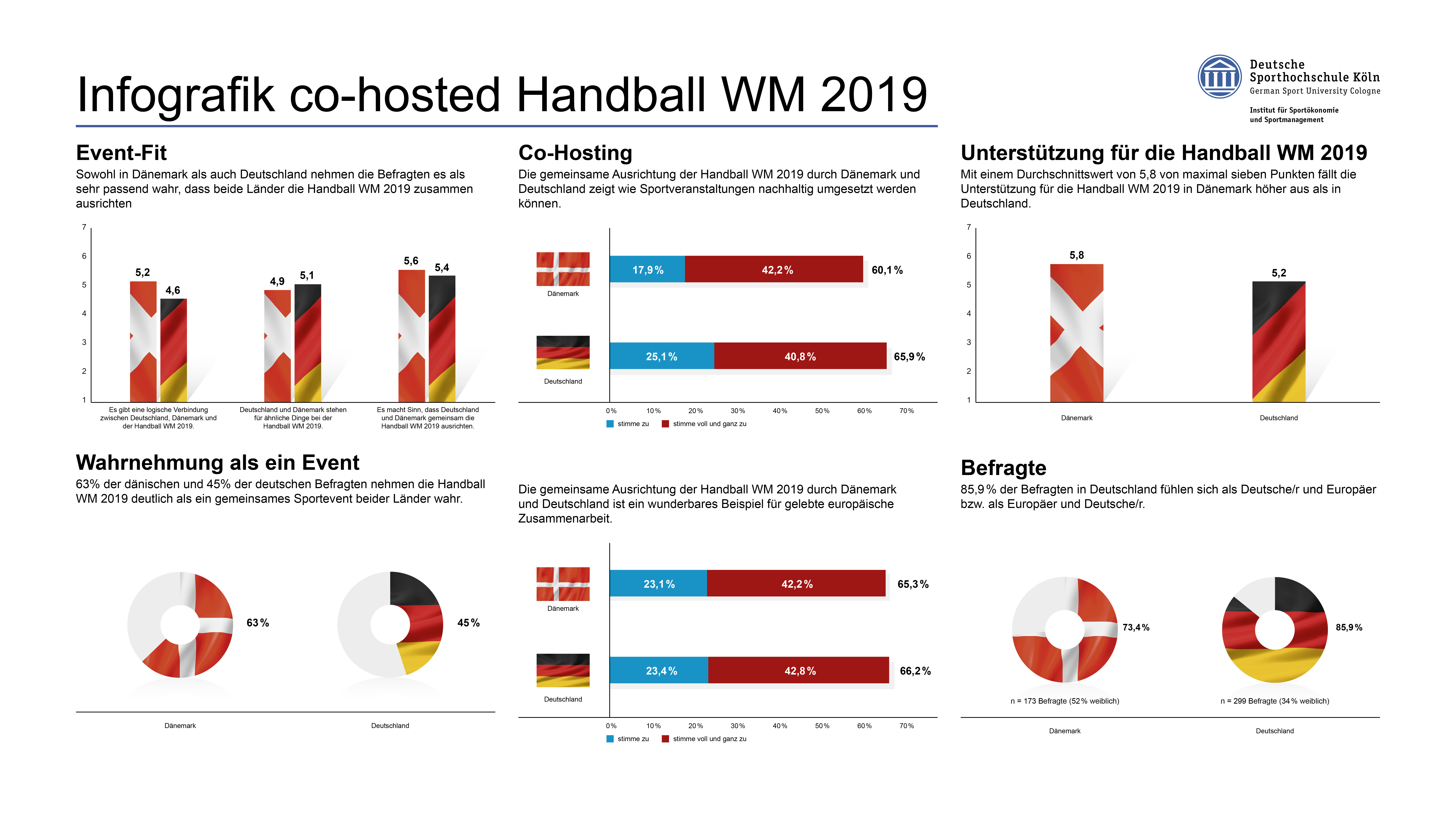 Die Befragten in beiden Ländern nehmen es als besonders passend wahr, dass Dänemark und Deutschland die WM zusammen ausrichten. Einem Teil der Befragten in beiden Ländern war jedoch gar nicht bewusst, dass die Handball WM durch zwei Länder ausgetragen wurde. Die Ergebnisse zeigen, dass die Wahrnehmung als ein gemeinsames Sportevent in Dänemark (63%) deutlich stärker ausgeprägt ist als in Deutschland (45%). In einer vorherigen Studie wurde die Wahrnehmung als eine Sportgroßveranstaltung als wichtige Voraussetzung für den Erfolg von co-hosted Sportevents und daraus resultierender gesellschaftlicher Wirkungen identifiziert.