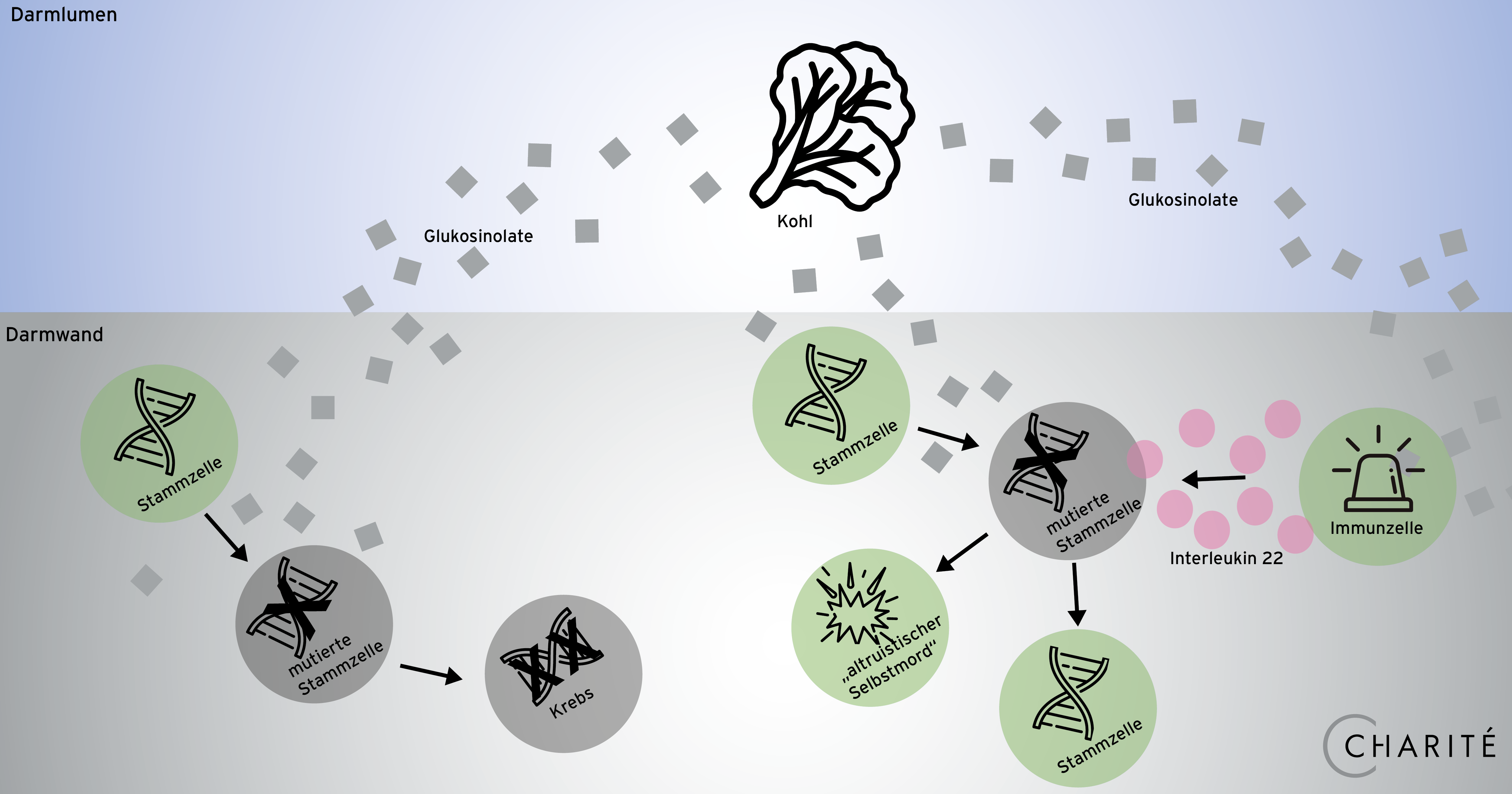 Gemeinsam mit weiteren Forschungsgruppen konnte das Team um Prof. Diefenbach im Mausmodell zeigen, dass Zellen des angeborenen Immunsystems in der Lage sind, erbgutschädigende Umweltfaktoren wie bestimmte Glukosinolate im Darm zu erkennen. Glukosinolate sind Bestandteile von Pflanzen, die unter anderem in zahlreichen Kohl-Arten zu finden sind. Nehmen die Immunzellen nun schädigende Glukosinolate wahr, senden sie den Botenstoff Interleukin 22 aus. Dieser bewirkt wiederum, dass die Stammzellen in der Darmwand etwaige Schäden ihrer DNA frühzeitiger entdecken und schneller reparieren können. „Das Immunsystem agiert also wie ein Sensor für erbgutschädigende Bestandteile der Nahrung“, erklärt Prof. Diefenbach. „Schalten wir diesen Sensor aus, beobachten wir eine deutlich erhöhte Zahl an Darmkrebsfällen.“