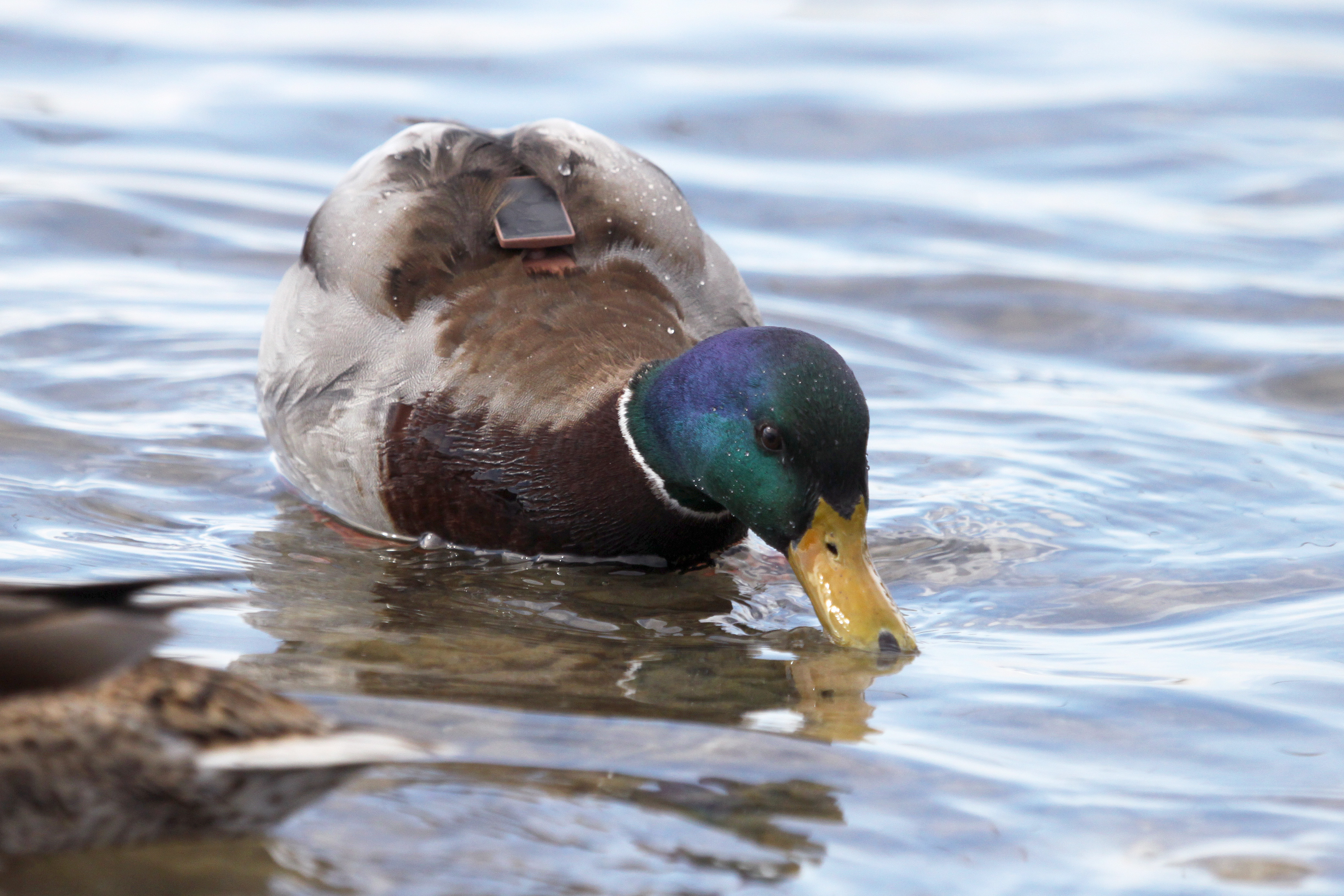 http://Photo of mallard with GPS transmitter: Photographer: Erik Kleyheeg