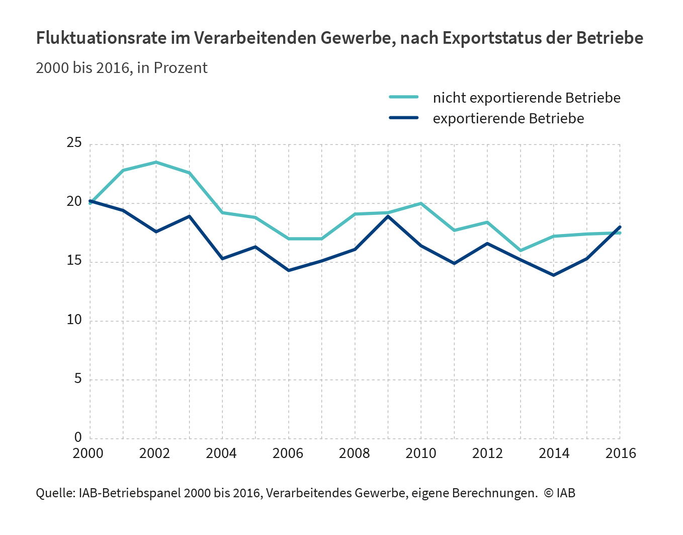 Die Fluktuationsrate setzt die in einem Jahr neu begonnenen und beendeten Beschäftigungsverhältnisse ins Verhältnis zur Zahl der Beschäftigten. In den Jahren 2000 bis 2016, dem Beobachtungszeitraum der Studie, betrug die Fluktuationsrate im Verarbeitenden Gewerbe im Schnitt knapp 20 Prozent – mit leicht sinkender Tendenz (2000: 20 Prozent, 2016: 18 Prozent). Exportierende Betriebe weisen dabei in den meisten Jahren eine um zwei bis vier Prozentpunkte niedrigere Fluktuationsrate auf als Betriebe, die ausschließlich für den einheimischen Markt produzieren. Darüber hinaus sind exportierende Betriebe im Schnitt größer, haben eine höhere Produktivität und bezahlen höhere Löhne.