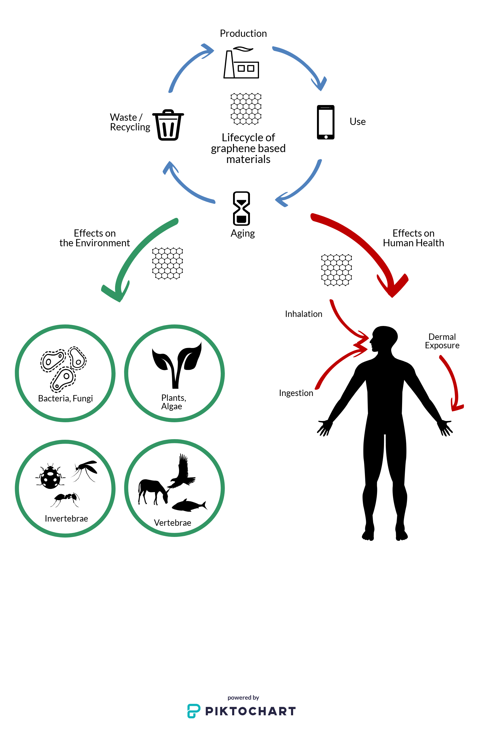 The article provides an overview of when parts of graphene-based materials can even enter the environment or the human body during their life cycle: during production, use, ageing or in the disposal or recycling process. The majority of the studies evaluated were devoted to the question of how graphene-based materials interact with the human body. These include the different ways in which materials can enter the body, for example by inhalation, ingestion or skin contact, as well as the distribution and interaction with important organs such as the central nervous system, lungs, skin, immune system, cardiovascular system, gastrointestinal tract and reproductive system.