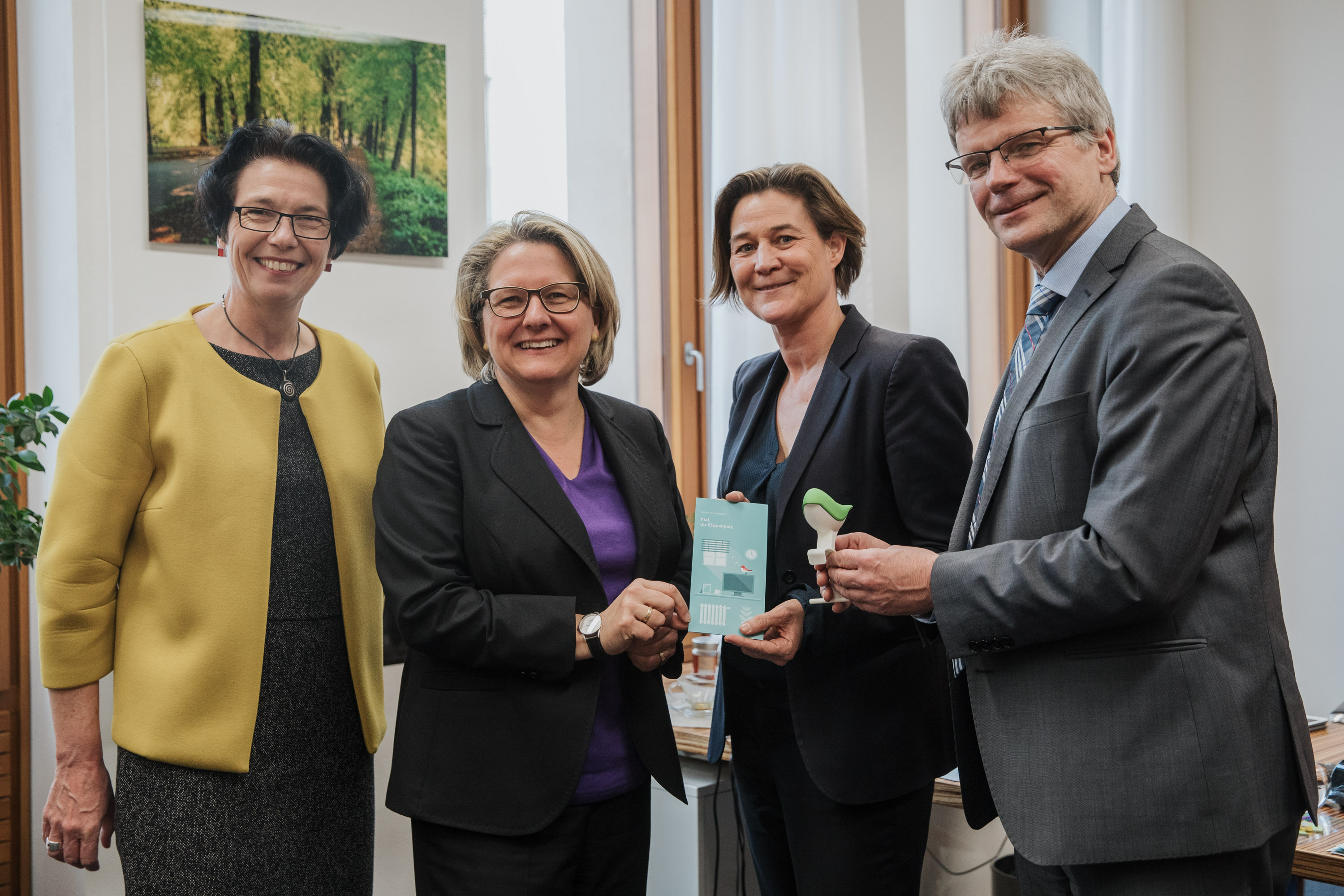 Klimaspatz „Piaf“ zieht ein in das Bundesumweltministerium (von links): Prof. Dr. Christa Liedtke, Leiterin der Abteilung Nachhaltiges Produzieren und Konsumieren am Wuppertal Institut, Bundesumweltministerin Svenja Schulze, sowie Dr. Carolin Baedeker (stellv. Leitung der Abteilung Nachhaltiges Produzieren und Konsumieren am Wuppertal Institut) und Prof. Dr. Viktor Grinewitschus von der EBZ Business School.