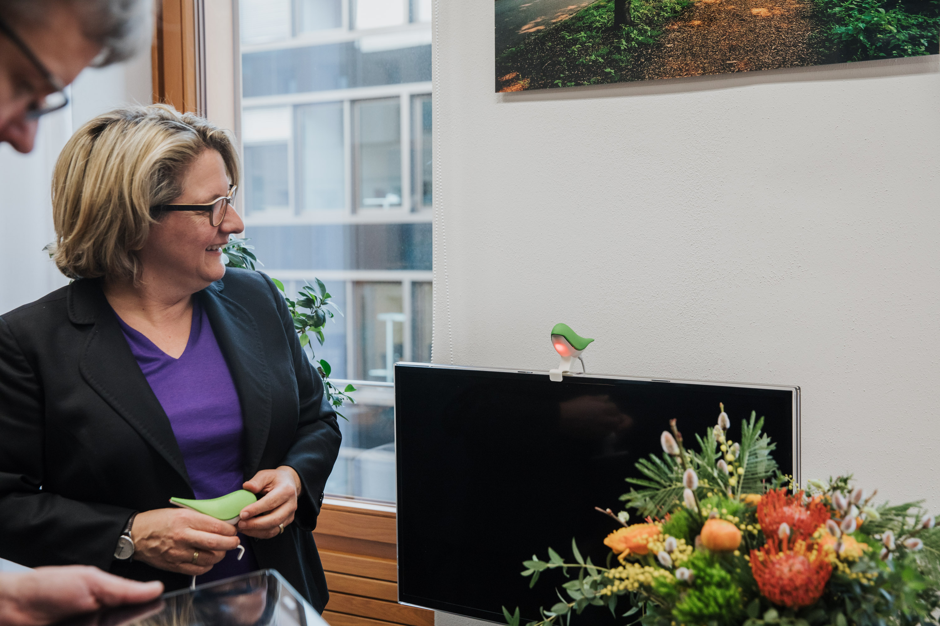 Der digitale Vogel „Piaf“ sitzt derzeit im Büro von insgesamt 25 Mitarbeiterinnen und Mitarbeiter des Bundesministeriums für Umwelt, Naturschutz und nukleare Sicherheit (BMU) – auch bei Bundesumweltministerin Svenja Schulze (im Bild).