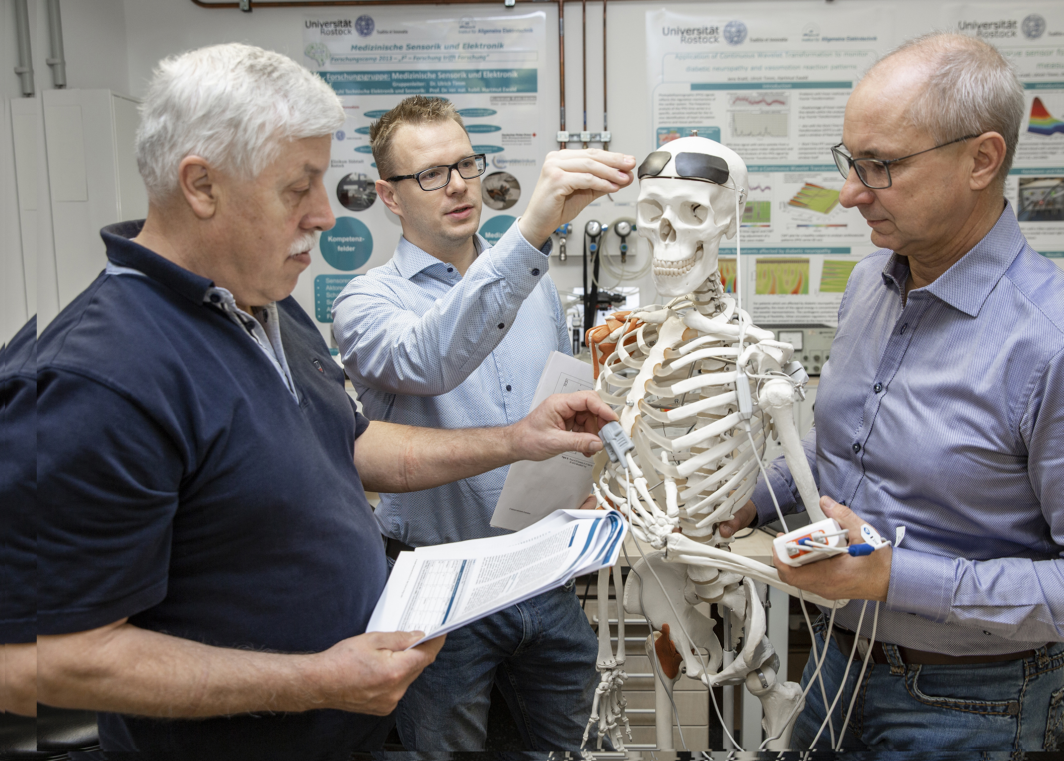 Wissenschaftler der Universität Rostock vom Lehrstuhl für Technische Elektronik und Sensorik entwickeln mit der Medizintechnikfirma Blueprint Medical ein Messgerät zur kontinuierlichen Messung der Sauerstoffsättigung im Gehirn ohne Blutentnahme.