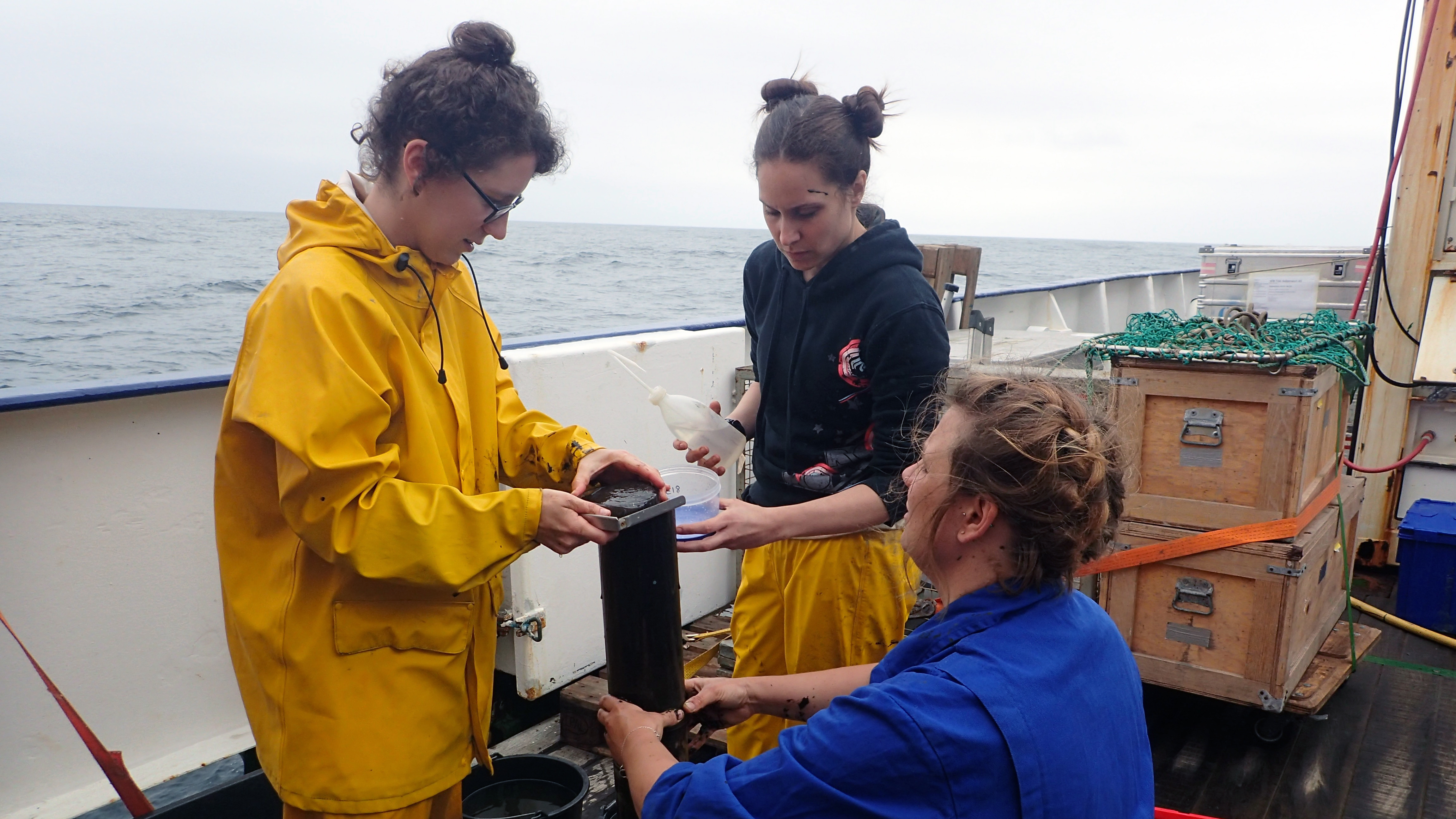 Caption: The scientists involved in the publication, Tanita Wein, Dr Alexandra-Sophie Roy and Dr Julia Weißenbach (from left to right) sample sediment obtained from the ocean floor off the Peruvian coast.