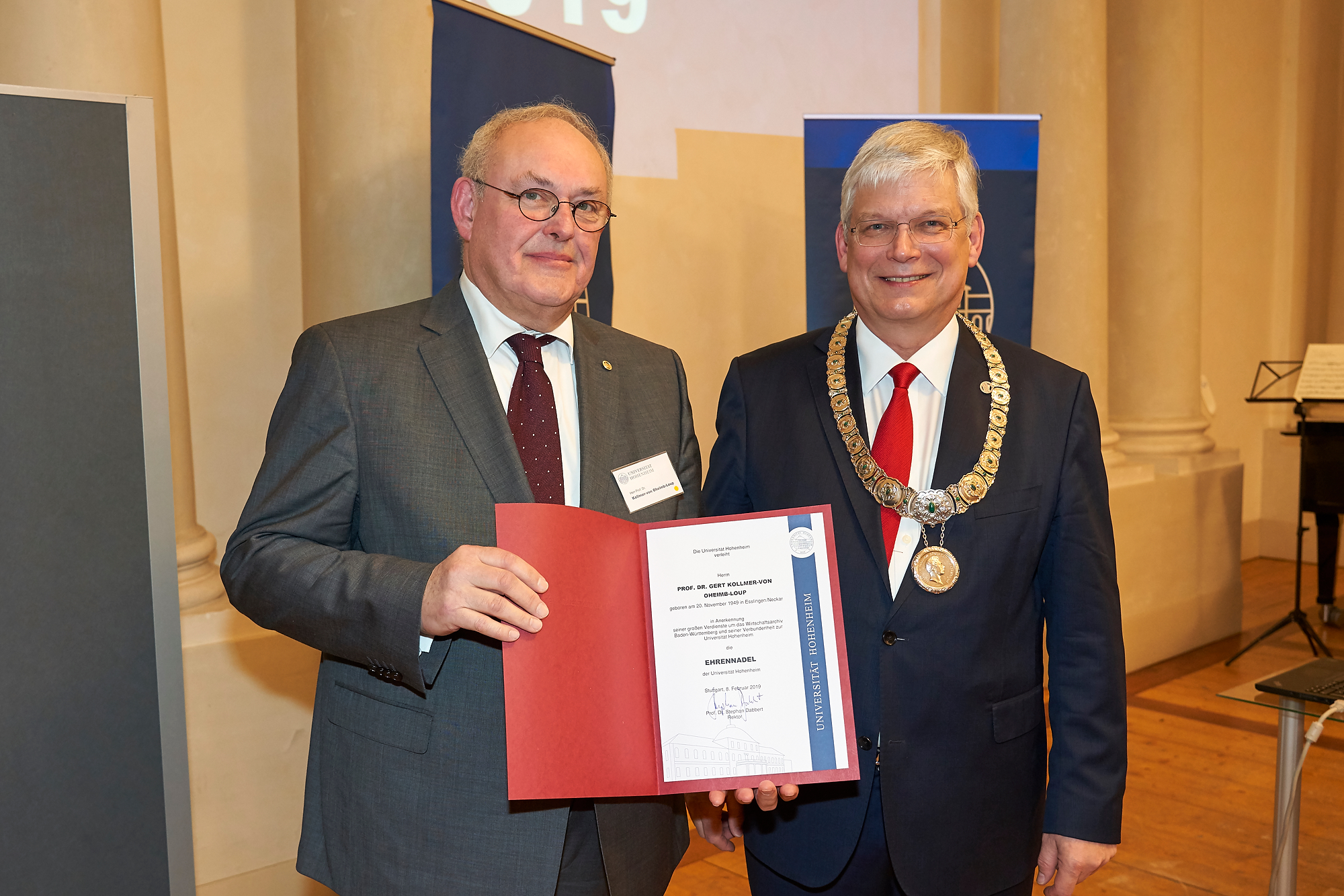 Prof. Dr. Gert Kollmer-v. Oheimb-Loup, Honorarprofessor der Universität Hohenheim in Stuttgart, wurde für seine Leistungen im Bereich Wirtschafts- und Sozialgeschichte in den Räumlichkeiten der Universität Hohenheim geehrt. Besondere Verdienste erwarb sich der Geehrte um den Aufbau des Wirtschaftsarchivs Baden-Württemberg, dessen Gründungsdirektor und Leiter er war.