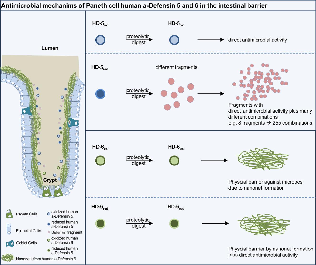 Es werden verschiedene Möglichkeiten antimikrobieller Abwehrmechanismen von Paneth-Zell Defensinen gezeigt. Während HD-5ox eine direkte antimikrobielle Wirkung zeigt, wird HD-5red von Proteasen in verschiedene, antimikrobiell aktive Fragmente gespalten. Im Gegensatz zu HD-5, ist weder HD-6ox noch HD-6red anfällig für den Verdau durch Proteasen weil dieses Defensin in der Lage ist Nanonetz-Strukturen zum Einfangen von Bakterien zu bilden. Nur HD-6red zeigt nach Veränderung der Struktur zusätzlich eine antimikrobielle Wirkung. Die verschiedenen Mechanismen sind eng miteinander verknüpft und schützen so unsere Oberfläche und regulieren die Mikrobiomzusammensetzung, was hier schematisch verdeutlicht wird.