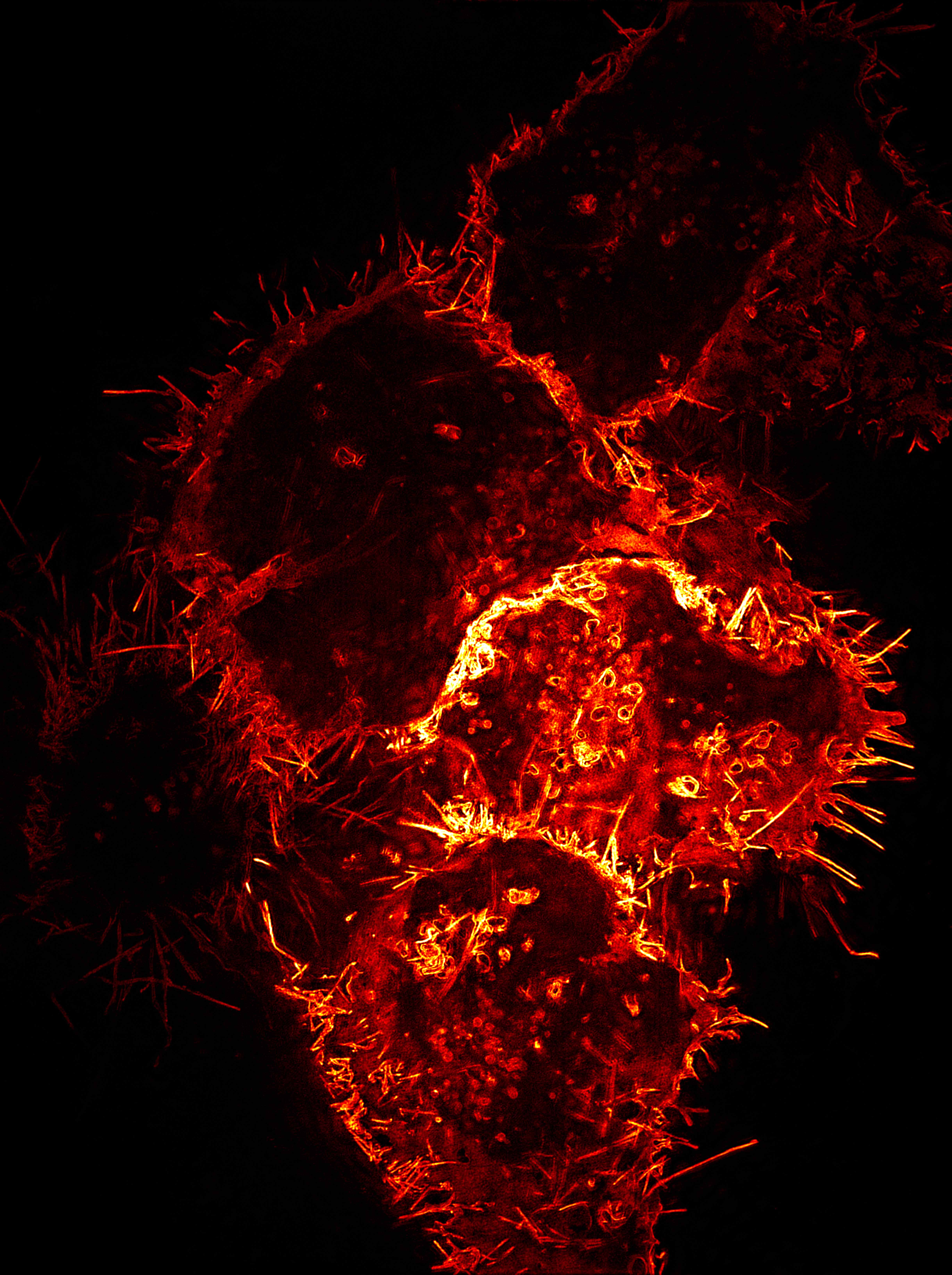 Menschliche Zellen, die Virosomen produzieren. Hierzu wurden die Zellen so verändert, dass sie fluoreszierendes Ebola Hüllprotein produzieren. Dieses wird in die Zellmembranen eingebaut und schnürt sich in Form von Virosomen ab. Diese haben eine Größe von ca. einem zehntausendstel Millimeter und wurden über hochauflösende Mikroskopie sichtbar gemacht.