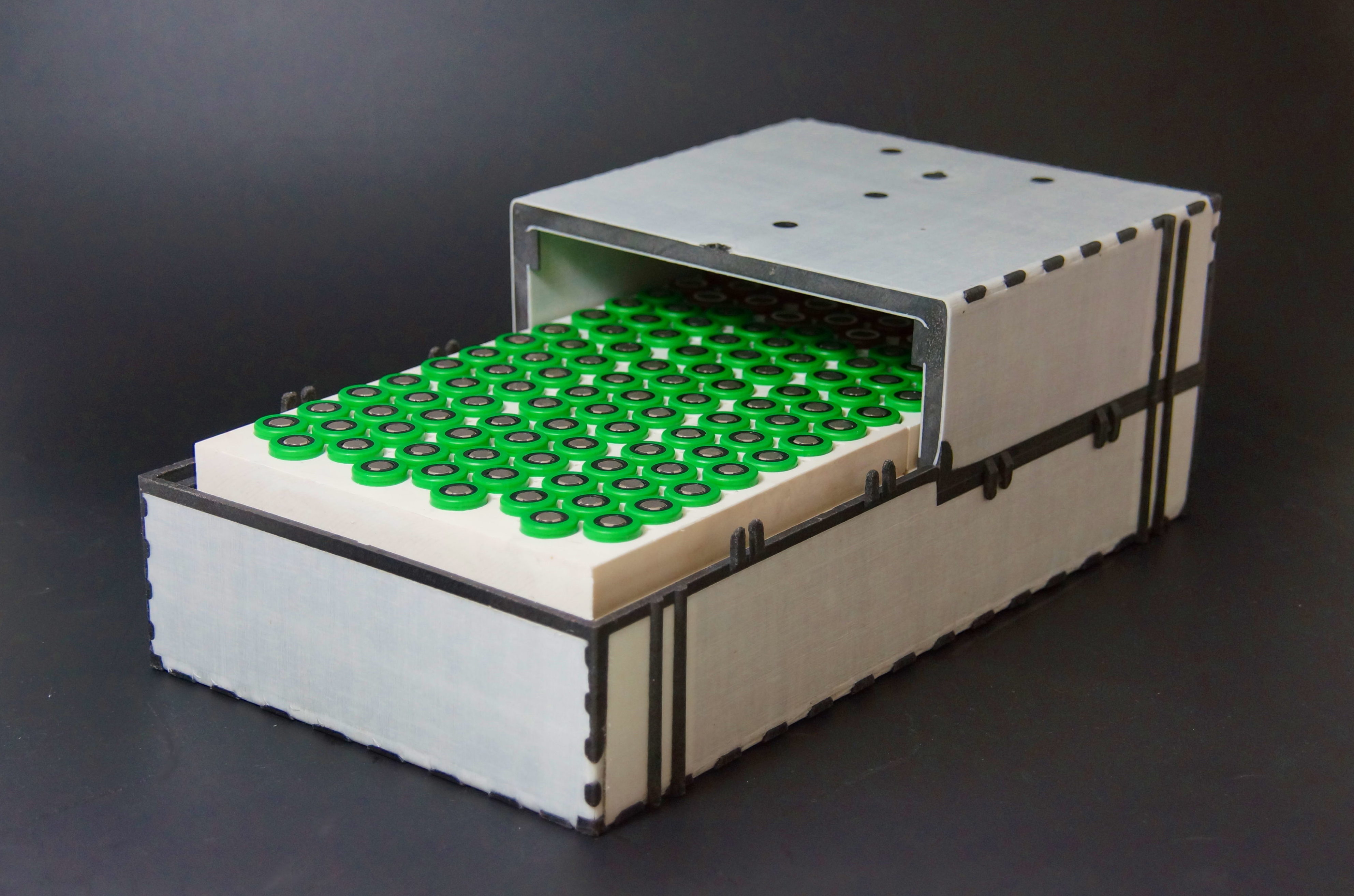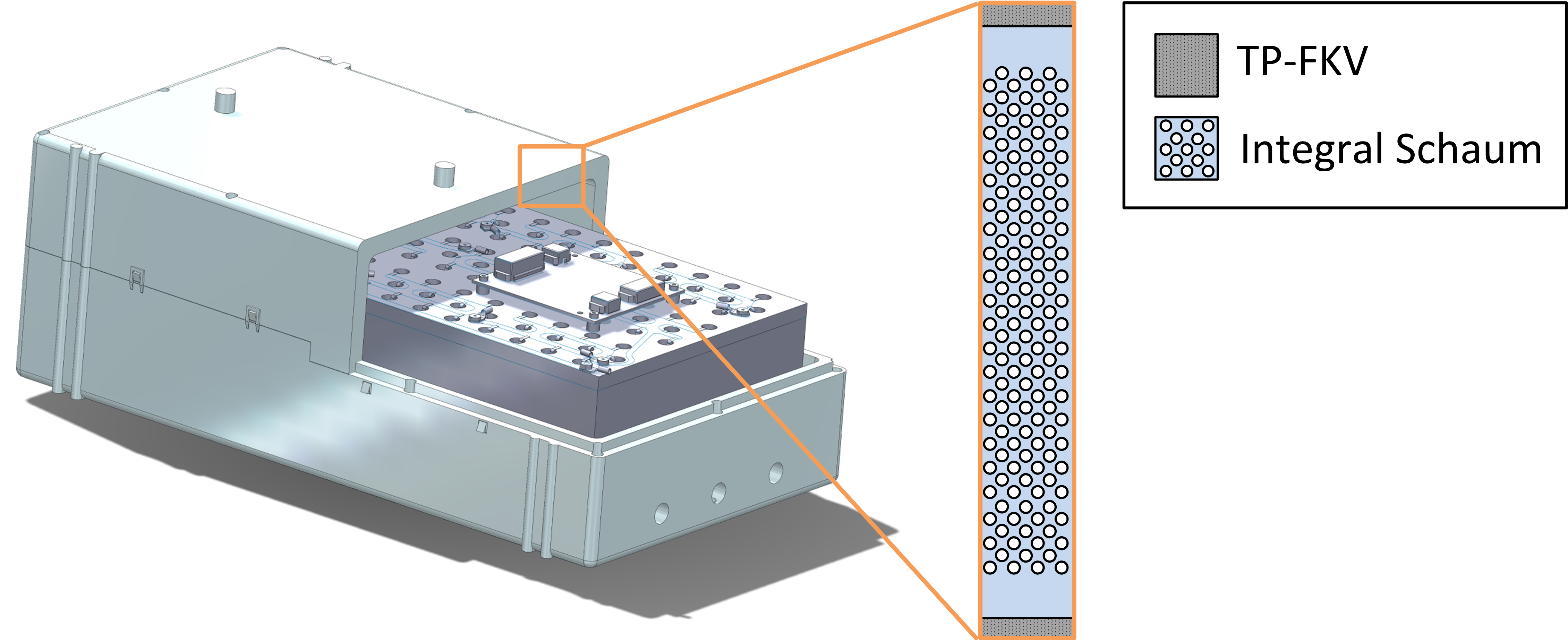 Mechanical and thermal requirements are provided by the novel CFRTP battery housing. This is composed by a sandwich structure based on UD tape facesheets (UDMAX™, SABIC) covering an integral polymer foam core. While the foam core provides thermal insulation, the facesheets bear most of the loads. For this purpose, LBF scientists consolidated UD tapes into a cross composite which was preformed into three dimensional (3D) composite facesheets. Between these 3D facesheets, the polymer foam core is injection moulded using a novel hybrid in-situ manufacturing process. The resulting sandwich construction has several advantages: It offers high lightweight potential and enables high specific bending properties and impact resistance. In addition, it provides a high level of protection against intrusion events, which play a major safety role especially in battery packs.