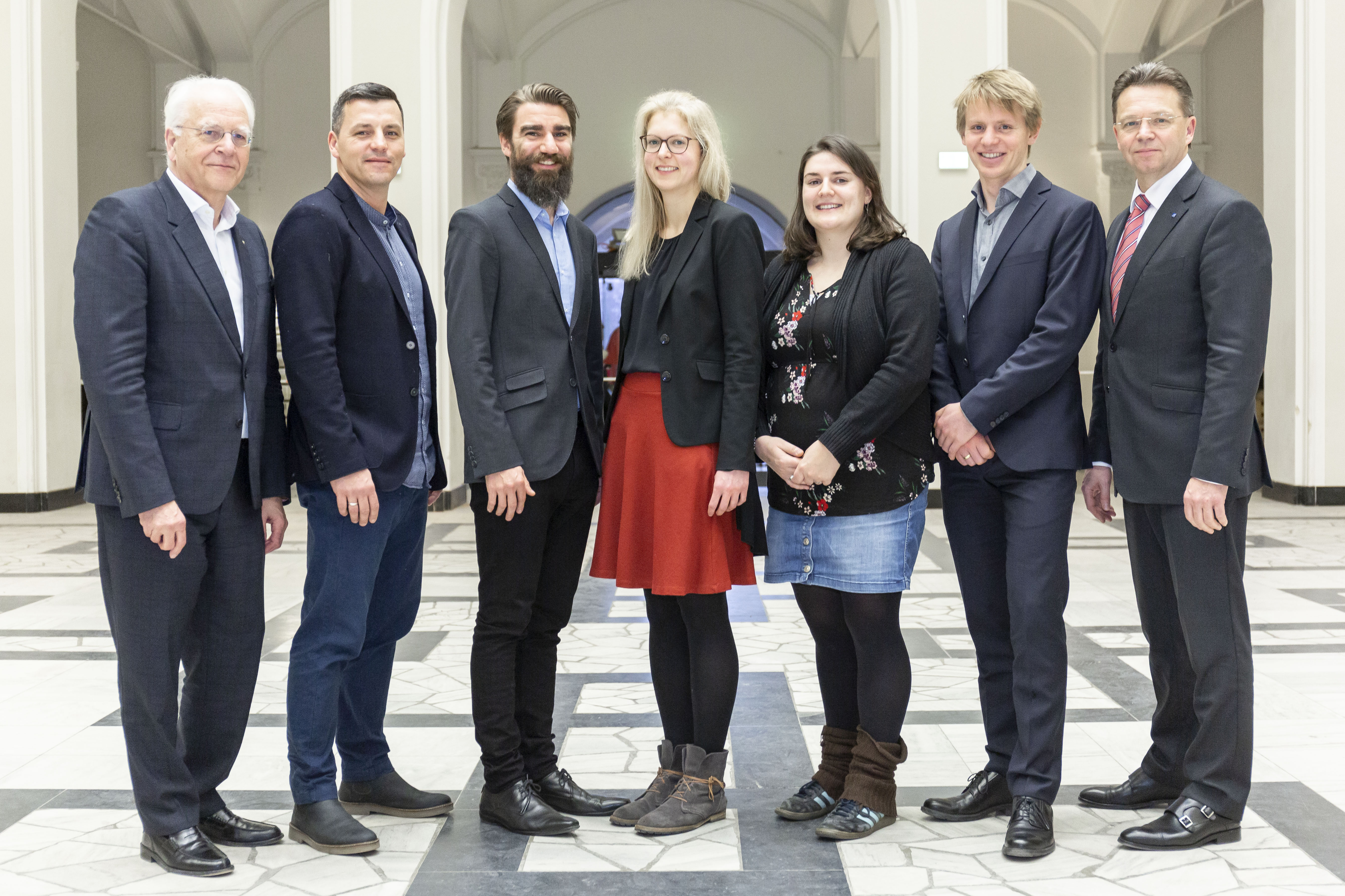 Prof. Dr.-Ing. Peter Wriggers, Vizepräsident für Forschung an der Leibniz Universität Hannover (LUH), hat die Urkunden am Mittwoch, 13. Februar 2019, an die Preisträgerinnen und Preisträger im Sitzungssaal des Hochschulrats im Welfenschloss überreicht. Mit der Einführung des neuen Förderprogramms will die LUH Potenziale erkennen und begabten Forscherinnen und Forschern den Übergang von der Promotion zur Professur erleichtern. Die fünf geförderten Vorhaben stehen für die gesamte Fächerbandbreite an der Leibniz Universität Hannover und sind an unterschiedlichen Fakultäten angesiedelt. Folgende Personen und Projekte und werden in der ersten Runde gefördert: