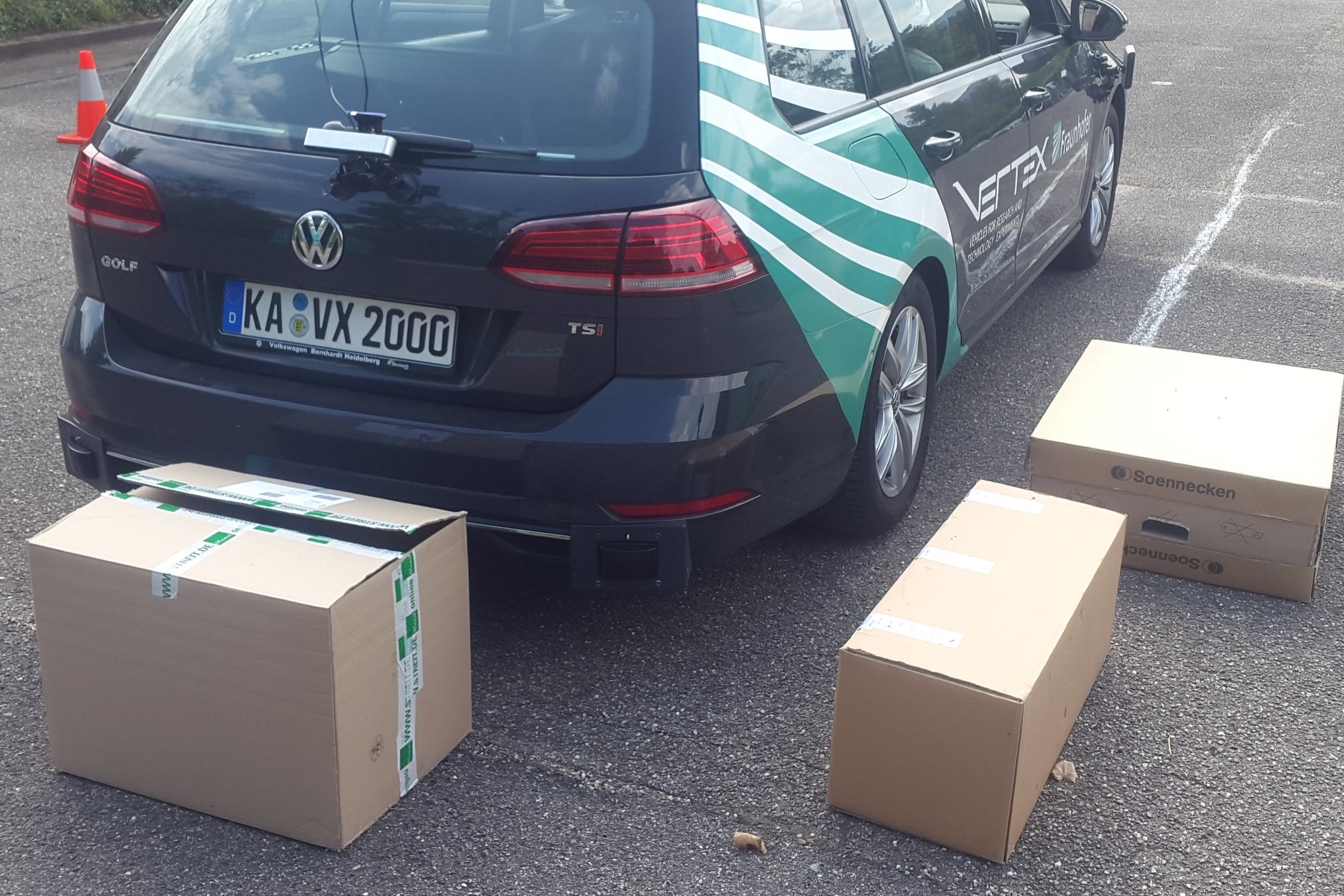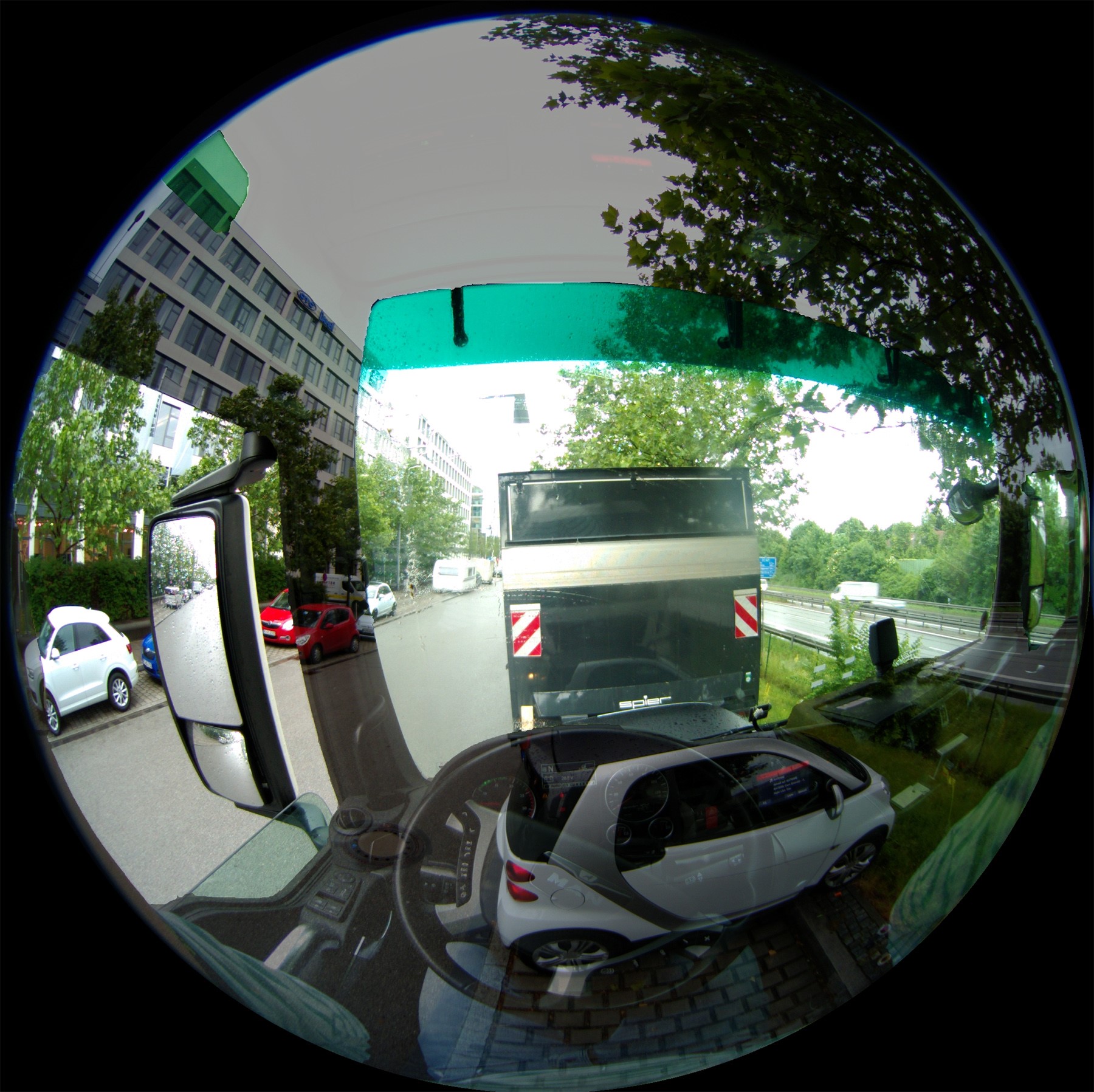 Daniel Reichert hat in seiner Masterarbeit am Fraunhofer Institut für Optronik, Systemtechnik und Bildauswertung IOSB in Zusammenarbeit mit der Firma Rio, einer Tochter des MAN-Konzerns, ein neuartiges Fahrzeug-Assistenzsystem für Rangier-Manöver von LKW entworfen, implementiert und evaluiert. Daran anschließend hat Daniel Secker im Rahmen seiner Masterarbeit ein Echtzeitsystem für PKW entwickelt und getestet. Mithilfe einer Virtual-Reality-Brille und Stereokameras macht es das Fahrzeug gewissermaßen durchsichtig, so dass der Fahrer alle Hindernisse direkt und dreidimensional an ihrer realen Position sehen kann. Genau genommen schafft das System eine erweiterte Realitätsdarstellung, eine Überlagerung der normalen Fahrer-Perspektive mit einer virtuellen Sicht, die ein Computer auf Basis der Kameraaufnahmen generiert.