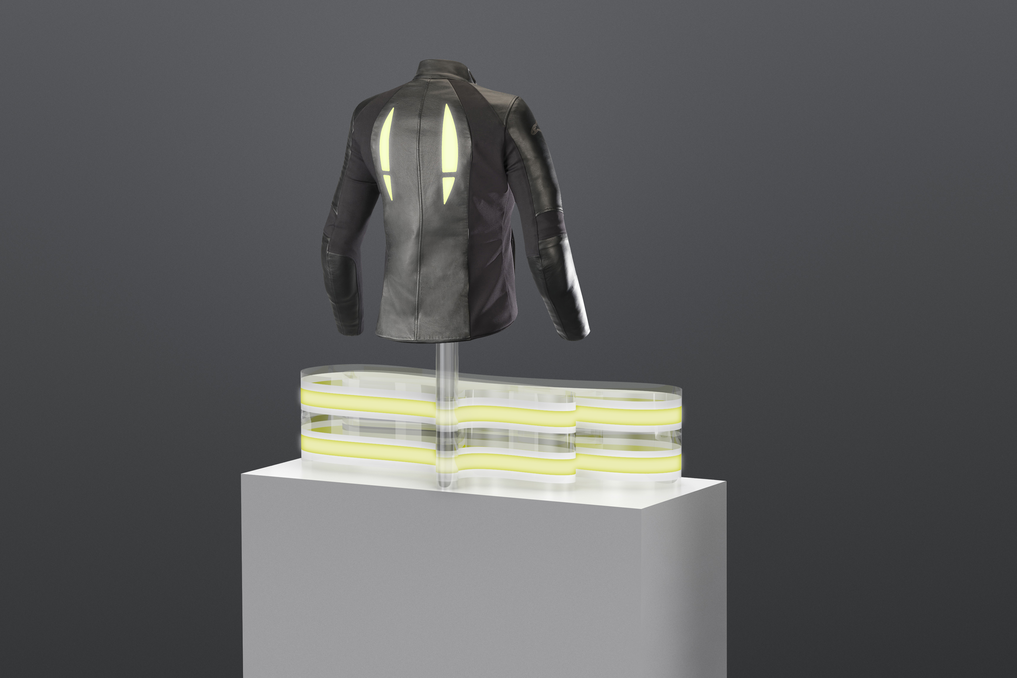 The Fraunhofer FEP, a provider of research and development services in the field of organic electronics, has long been involved in the development of technologies and processes for organic electronics and component integration. The team at the design company of EMDE development of light GmbH also has many years of experience with the new organic light-emitting diode light (OLED), including development of the world's first OLED luminaire series. OLEDs cannot only emit colored and wide area light, but they themselves are also extremely low-profile and flexible, allowing them to be integrated into many types and shapes of surfaces. They can be even be designed to be transparent and dimmable. To demonstrate the sheer endless potential for employing OLEDs, the designers at EMDE are now integrating flexible OLEDs for the first time into a motorcycle jacket. Used as a material for clothing, OLEDs not only can trigger completely new aesthetic trends, they can also provide active illumination instead of just limited reflectance. This enhanced visibility from all angles means the wearer can be seen more clearly, increasing rider safety.