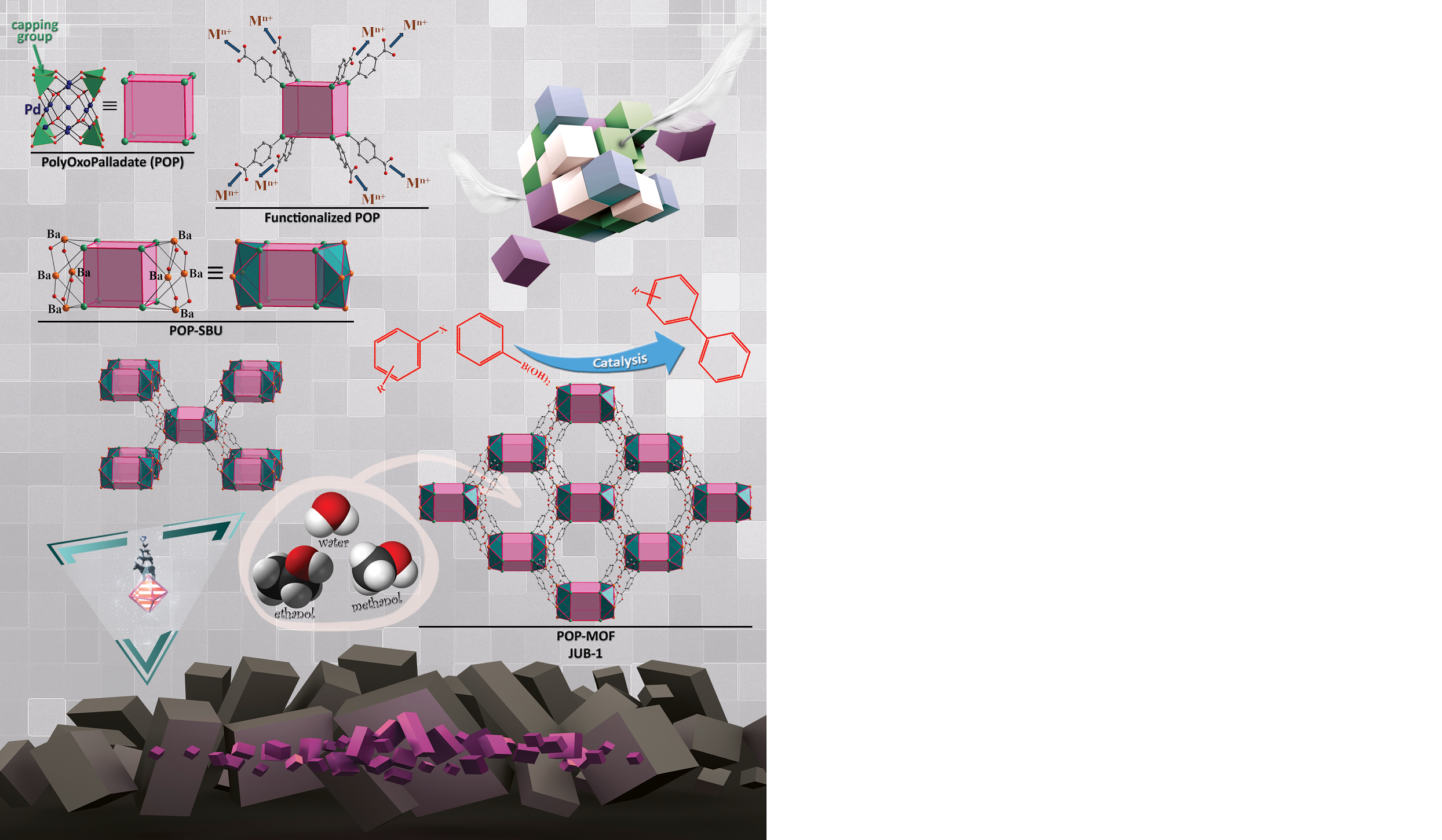Vor diesem Hintergrund entwickelten Prof. Kortz und seine Mitarbeiter Dr. Saurav Bhattacharya und Dr. Wassim W. Ayass eine Strategie, bei der sie extern modifizierte diskrete POPs als Bausteine für den Aufbau eines starren und katalytisch aktiven Gerüstmaterials, einem sogenannten Metal-Organic Framework (MOF) verwenden konnten. MOFs sind eine wichtige Materialklasse, die sich durch geordnete periodische Netzwerke von molekularen Komponenten (Metallionen oder Cluster) auszeichnet, die durch organische Gruppen (Linker) dreidimensional miteinander verbunden sind, was zu einer stabilen Gerüststruktur mit zugänglichen Hohlräumen oder Poren führt. Dies lässt sich mit dem Skelett eines Fachwerkhauses vergleichen, wo die Eckpfosten (Metallionen oder Cluster) durch Querbalken (starre organische Linker) in Position gehalten werden und die Wohnräume im Inneren den Poren des MOF entsprechen.