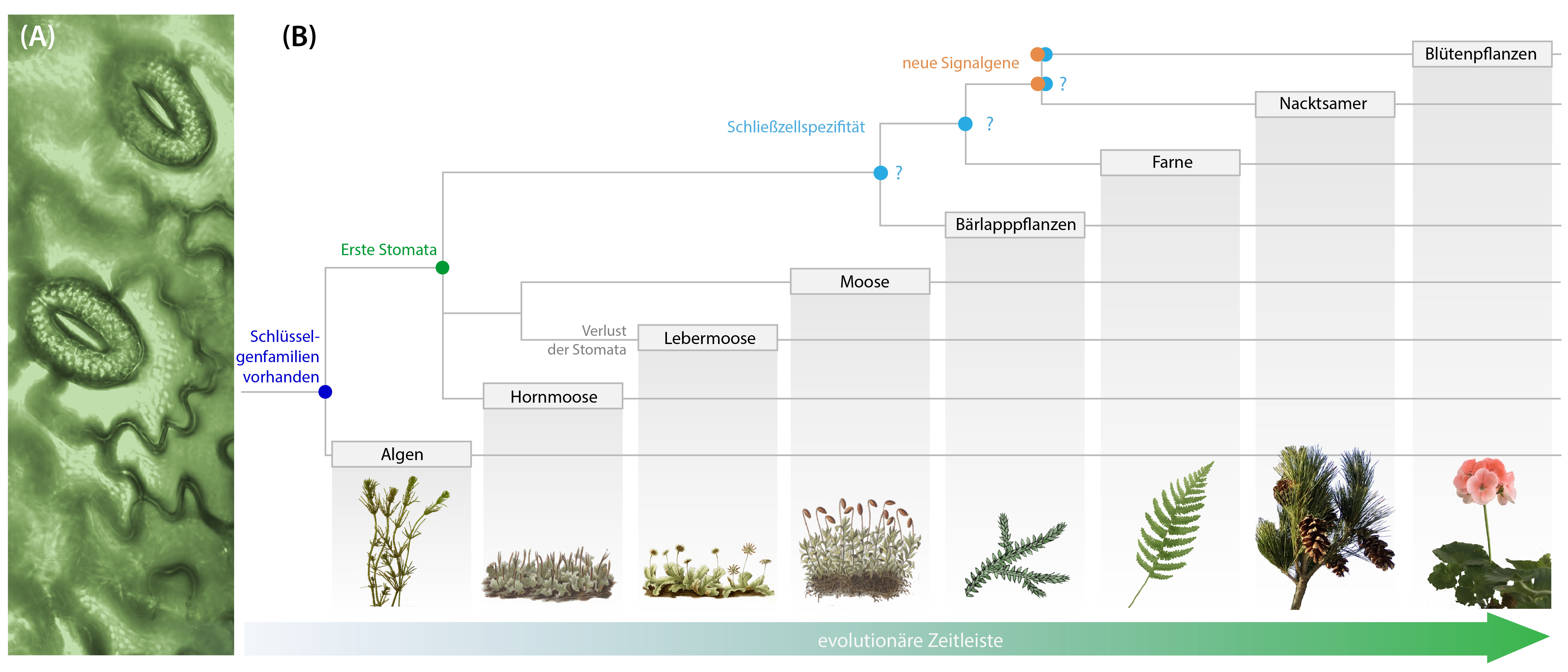 Das JMU-Team hat die Evolutionsgeschichte wichtiger Gene rekonstruiert, die bei Blütenpflanzen die Bewegung der Stomata kontrollieren. Es stellte sich heraus, dass die meisten dieser Gene evolutionsbiologisch zu alten Genfamilien gehören, die in allen Pflanzengruppen einschließlich der Grünalgen vorkommen. Vermutlich haben sich diese Gene schon entwickelt, bevor die ersten Pflanzen als Moose und Farne das Land besiedelten.