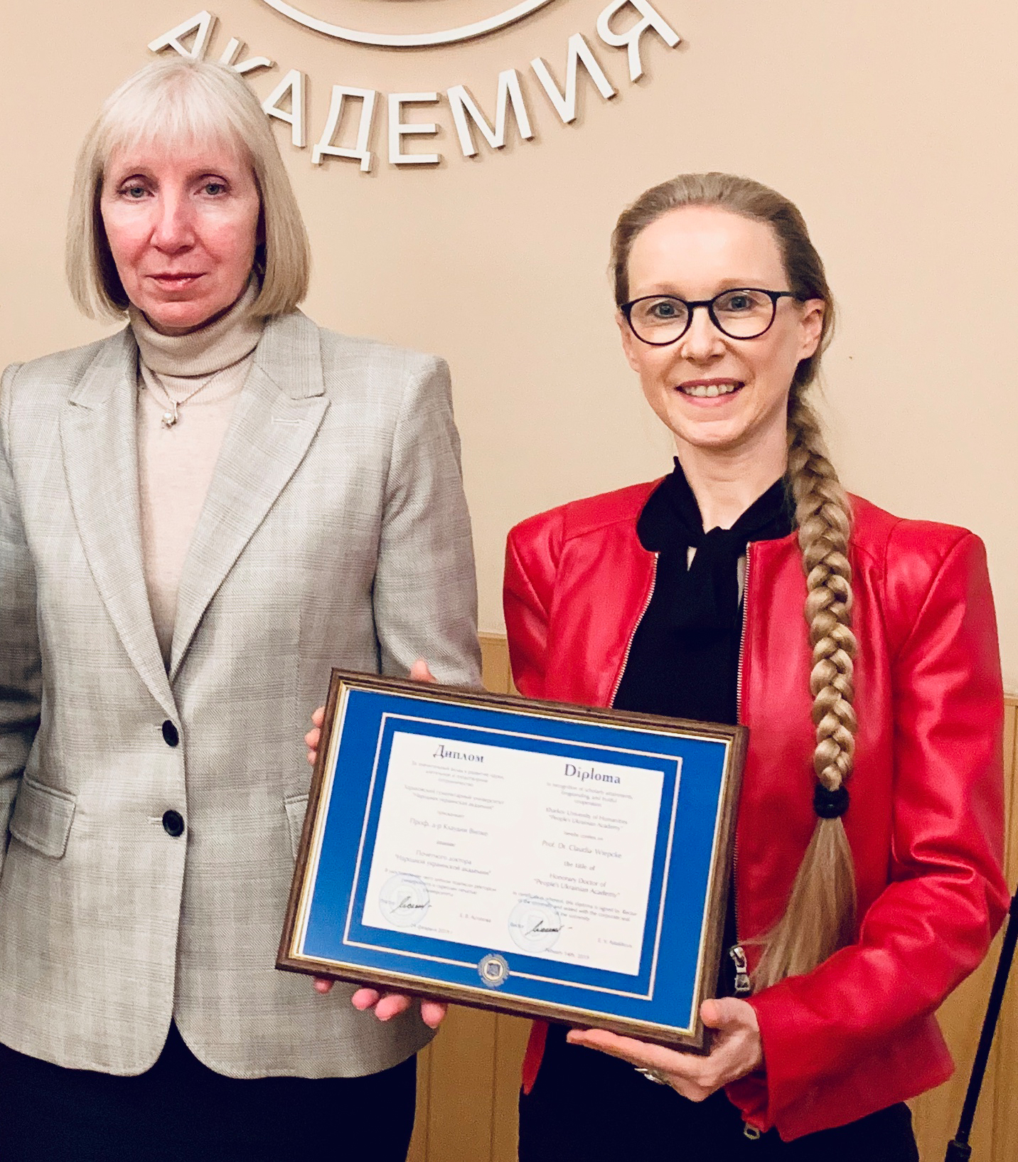Die Honorarprofessur zielt auf weitere regelmäßige Lehr- und Forschungsaufenthalte an der Kharkov University of Humanities. Auch in Zukunft will Prof. Dr. Claudia Wiepcke dort interkulturelle Projektseminare im Bereich Social Entrepreneurship realisieren. Entgegengenommen hat die Wissenschaftlerin die Ehrungen während der internationalen Konferenz „Smart Education in a Smart Society“, die Mitte Februar an der Kharkov University of Humanities stattfand.