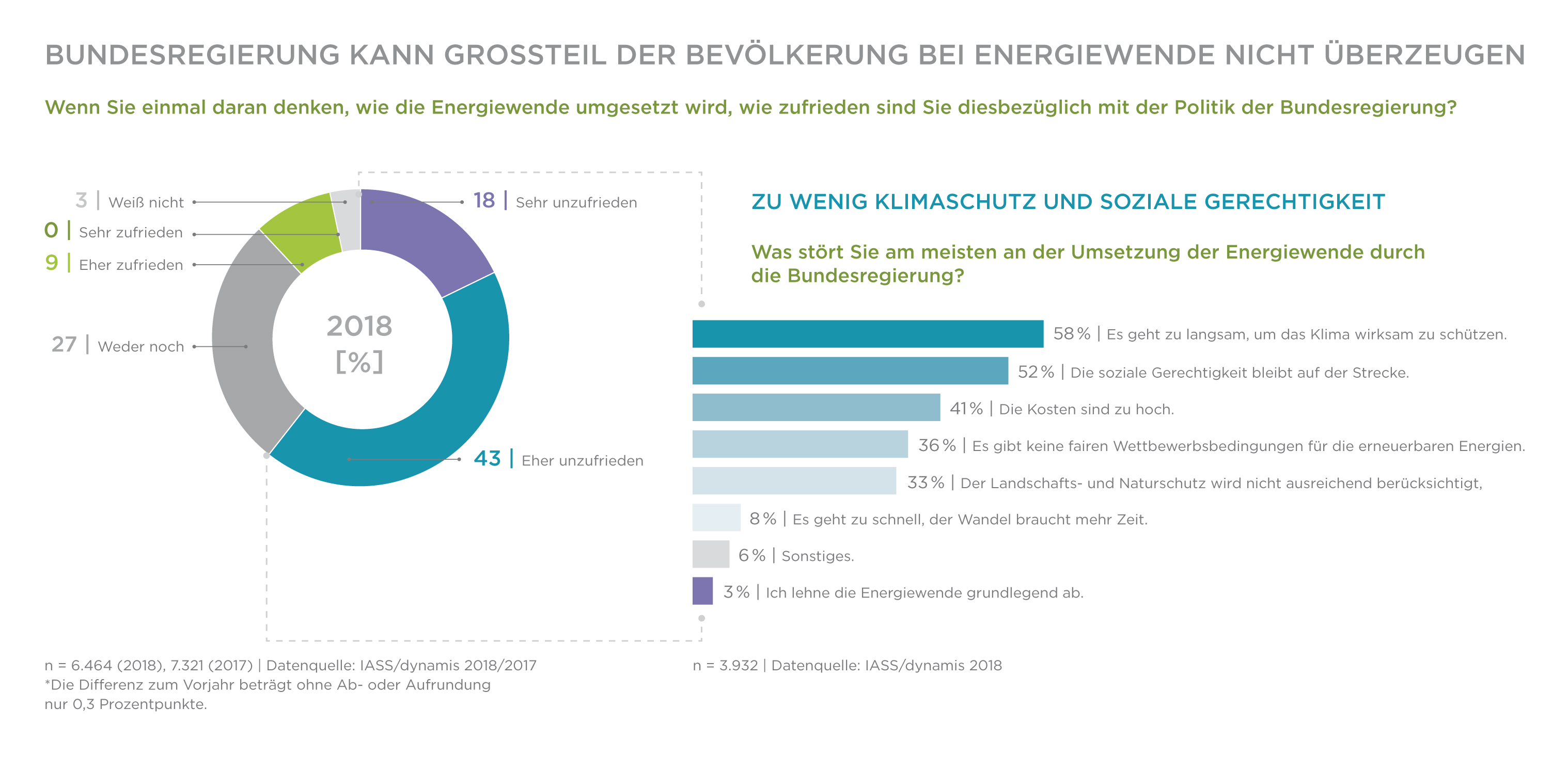 Mehr als die Hälfte der Bevölkerung (61 Prozent) ist mit der Politik der Bundesregierung im Hinblick auf die Umsetzung der Energiewende unzufrieden, dies ist eine deutliche Steigerung um zwölf Prozentpunkte im Vergleich zur Befragung 2017. Auch die Mehrheit der Anhänger der Regierungsparteien ist in Sachen Energiewende mit der Bundesregierung unzufrieden. Als einen der wichtigsten Gründe für die Unzufriedenheit mit der Bundesregierung nennen 58 Prozent derjenigen, die mit der Energiewende unzufrieden sind, eine zu langsame Umsetzung der Energiewende und damit fehlende Wirksamkeit beim Klimaschutz. Knapp über die Hälfte (52 Prozent) stört mit am meisten, dass die soziale Gerechtigkeit nicht ausreichend Berücksichtigung findet.