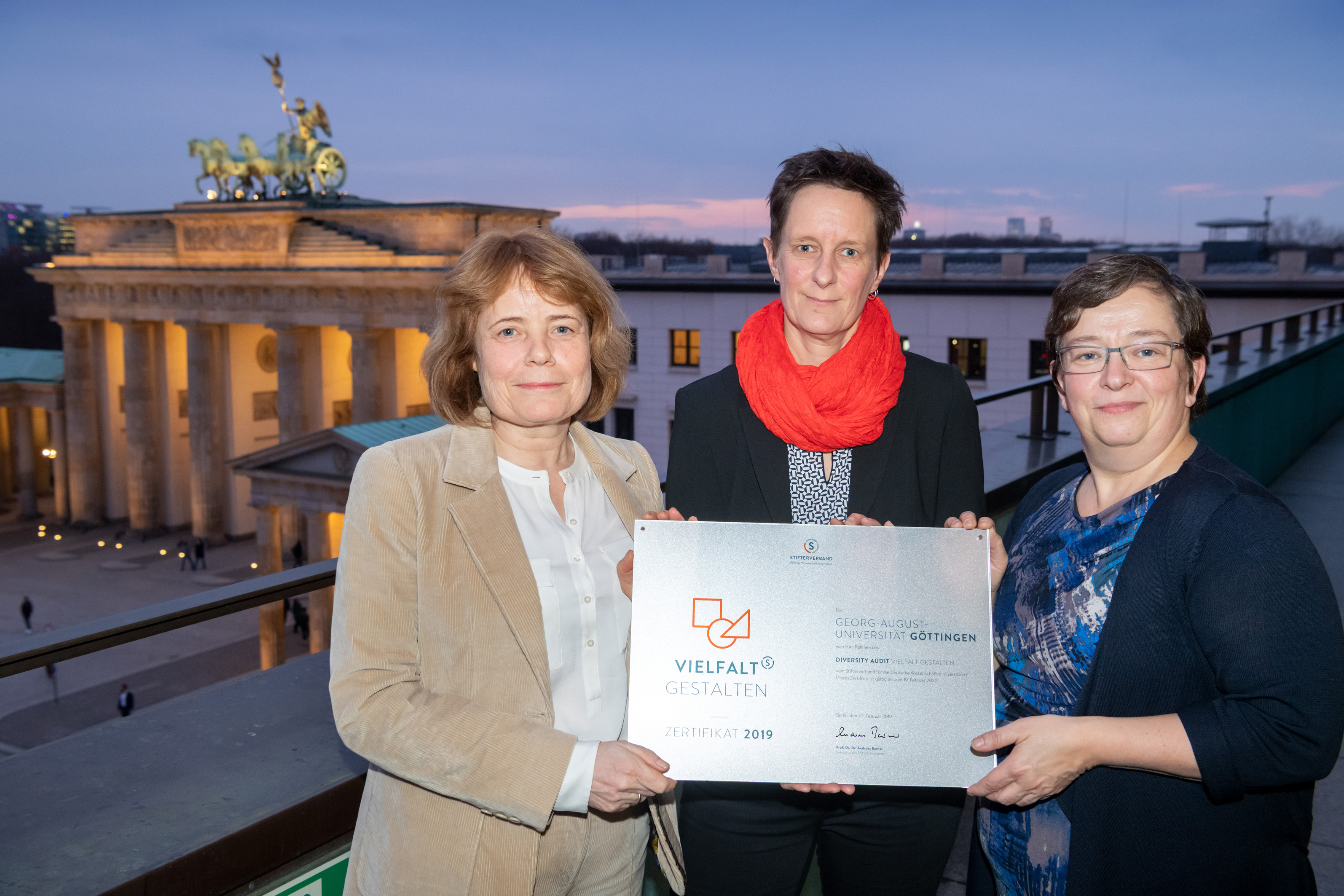 (pug) Der Stifterverband hat die Universität Göttingen zum Abschluss eines zweijährigen Prozesses mit dem Zertifikat des Diversity Audits „Vielfalt gestalten“ ausgezeichnet. Mit dem Zertifikat würdigt der Stifterverband Hochschulen, die Konzepte und Maßnahmen für einen produktiven Umgang mit der Diversität ihrer Mitglieder und Angehörigen entwickeln. Die feierliche Auszeichnung aller prämierten Hochschulen fand am 20. Februar 2019 in Berlin statt.