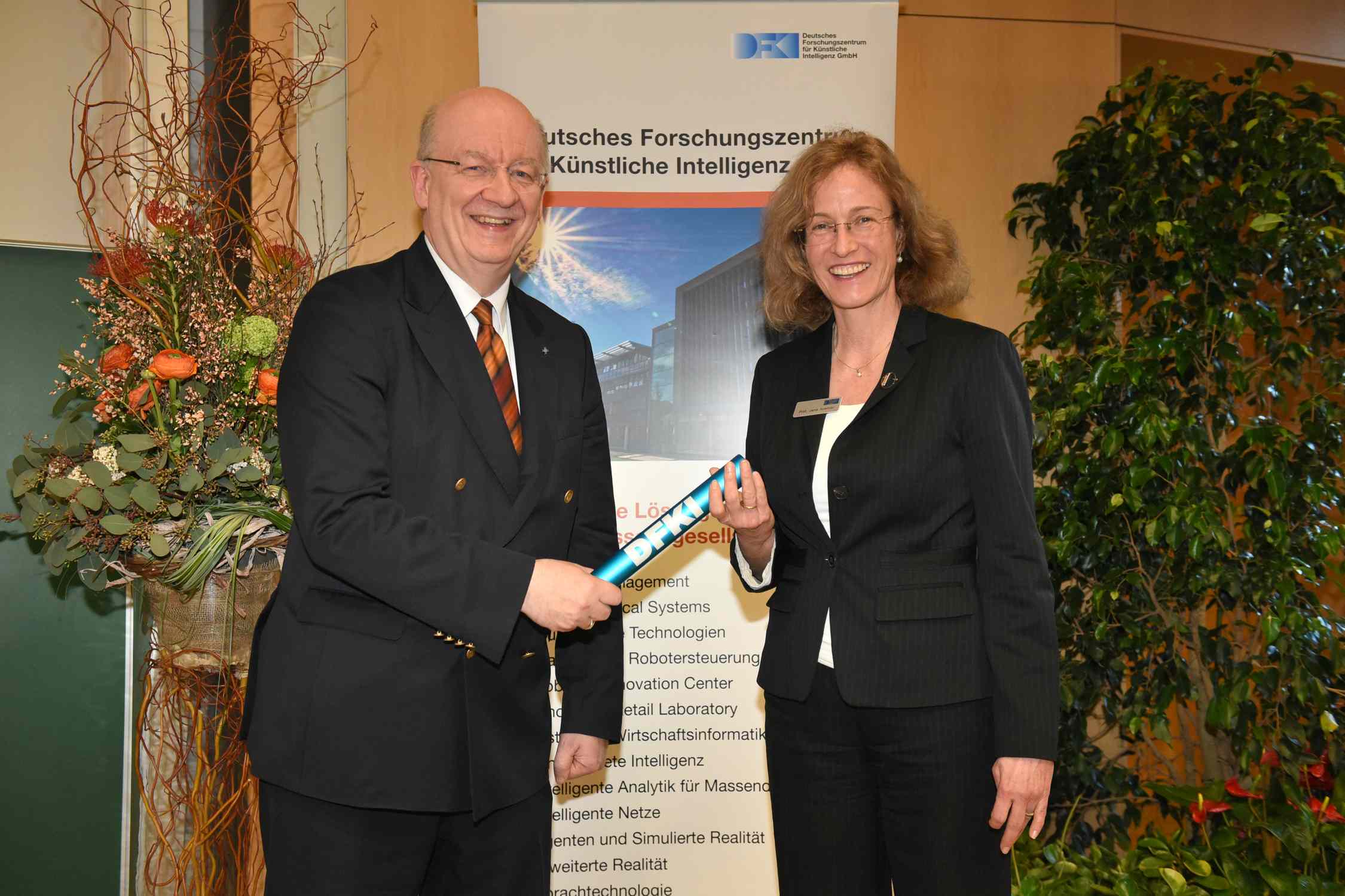 The Chairman of DFKI's Supervisory Board Prof. Dr. h.c. Hans-Albert Aukes paid tribute to the achievements and cooperation over the past two decades: “Today's event truly marks a milestone in the exciting history of DFKI. For more than 20 years, Prof. Wahlster, as Chairman of the Board of Directors, has been driving the scientific development of DFKI as well as the development of the company. New topics with worldwide impact have been developed, new research areas, new Living Labs and new locations opened. This was a very eventful and very successful time. As Chairman of the Supervisory Board, I would like to thank Prof. Wahlster on behalf of all shareholders and I wish Prof. Koehler a happy hand for her new task. I am sure that Prof. Wahlster will maintain friendly relations with DFKI and with myself”.