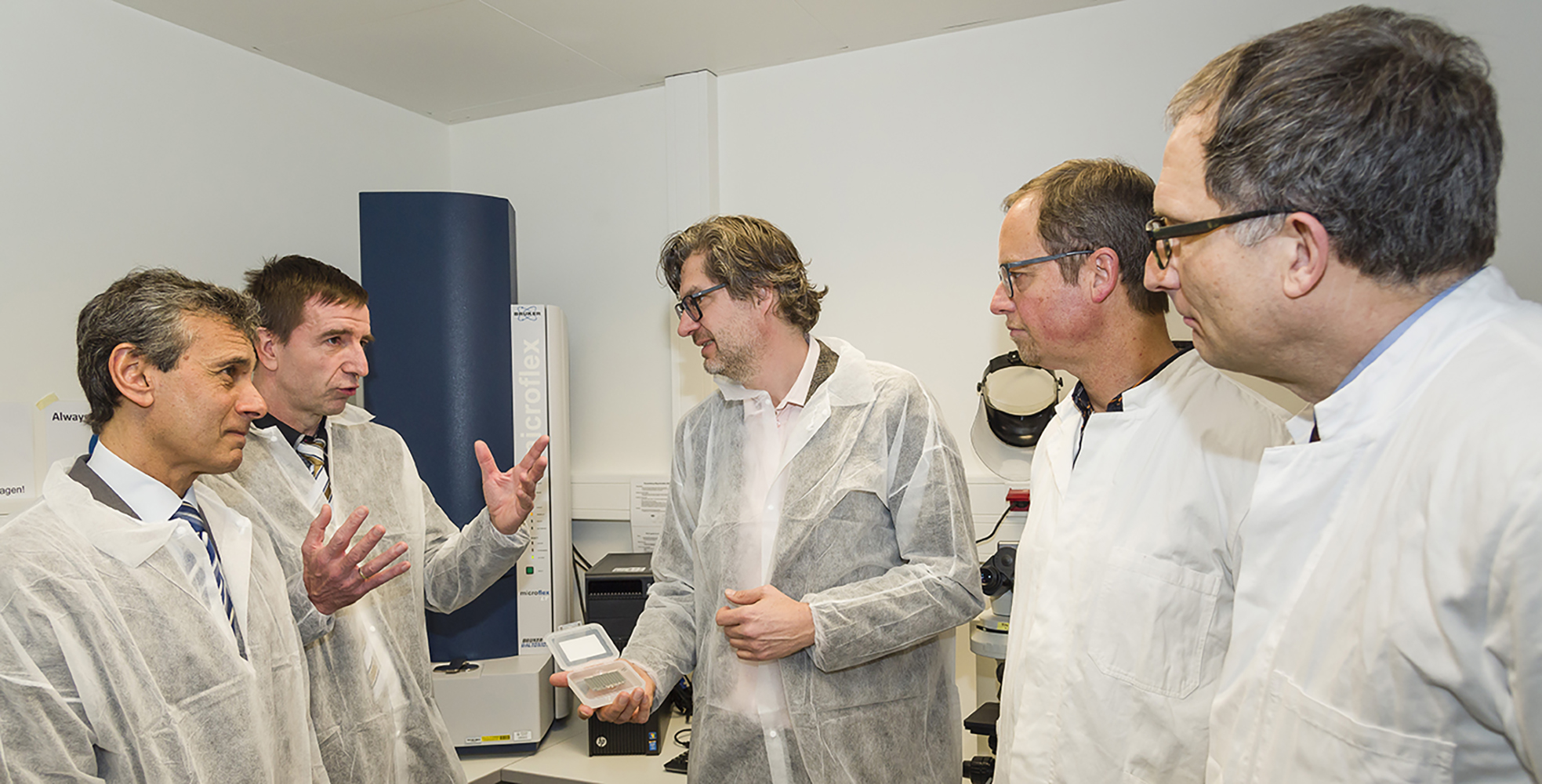 Um die gemessenen Daten abgleichen zu können, bedarf es allerdings einer bestimmten Software. Auch hierfür konnte Professor Hannemann aufgrund der guten Kontakte der Fakultät zu Unternehmen der Pharmabranche eine Kooperation vereinbaren. Der Hersteller des gespendeten MALDI-TOF Massenspektrometers, die Firma Bruker Daltonik, stellt der Hochschule die erforderliche Software zur Verfügung. Die Lizenz beinhaltet eine aktuelle Datenbank zur Differenzierung der Mikroorganismen. Damit sei es möglich, die Keime innerhalb von wenigen Minuten zu analysieren, erläutern die Firmenvertreter Dr. Gerold Schwarz und Dr. Johannes Kadel. Das vor rund zehn Jahren eingeführte System habe deshalb schnell Einzug in die klinische und biopharmazeutische Herstellungspraxis genommen, ergänzt Feuser, weshalb es für ein Unternehmen wie Boehringer Ingelheim wichtig sei, dass Absolventen der Biotechnologie mit der Technik vertraut sind.