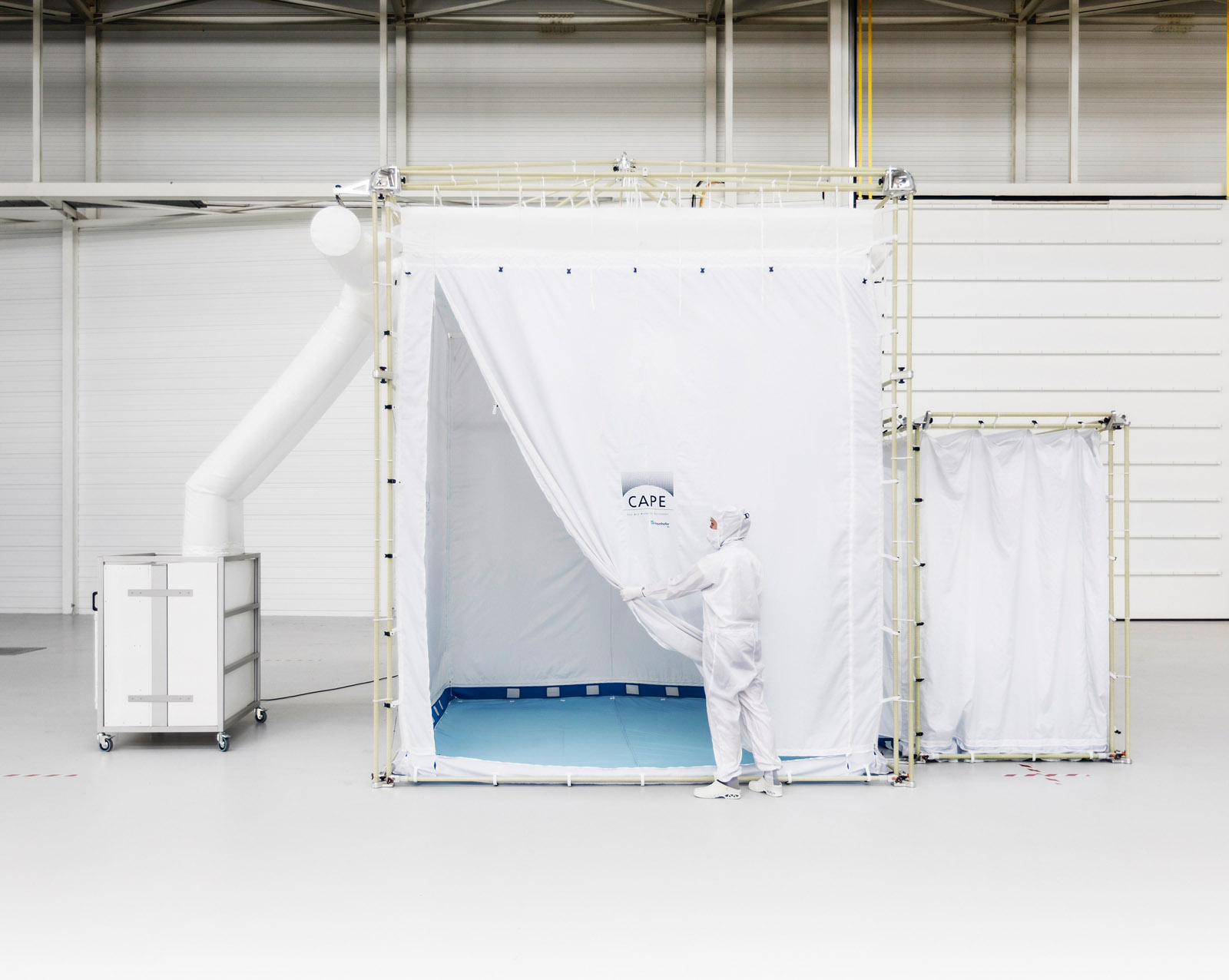 Mit CAPE® haben Forscherinnen und Forscher des Fraunhofer-Instituts für Produktionstechnik und Automatisierung IPA ein mobiles, zeltähnliches Reinraumsystem entwickelt, das sich in weniger als einer Stunde sowohl in Innenräumen als auch in wettergeschützten Außenbereichen aufbauen lässt. Der Anstoß zu dieser Innovation ist auf die OHB System AG, einen bedeutenden Keyplayer der europäischen Raumfahrt, zurückzuführen. CAPE® schützt empfindliche Produkte beim Herstellungsprozess, aber auch bei der Vermeidung von Querkontaminationen. Darüber hinaus lassen sich Anlagen und Produkte unter der Einhausung sterilisieren.