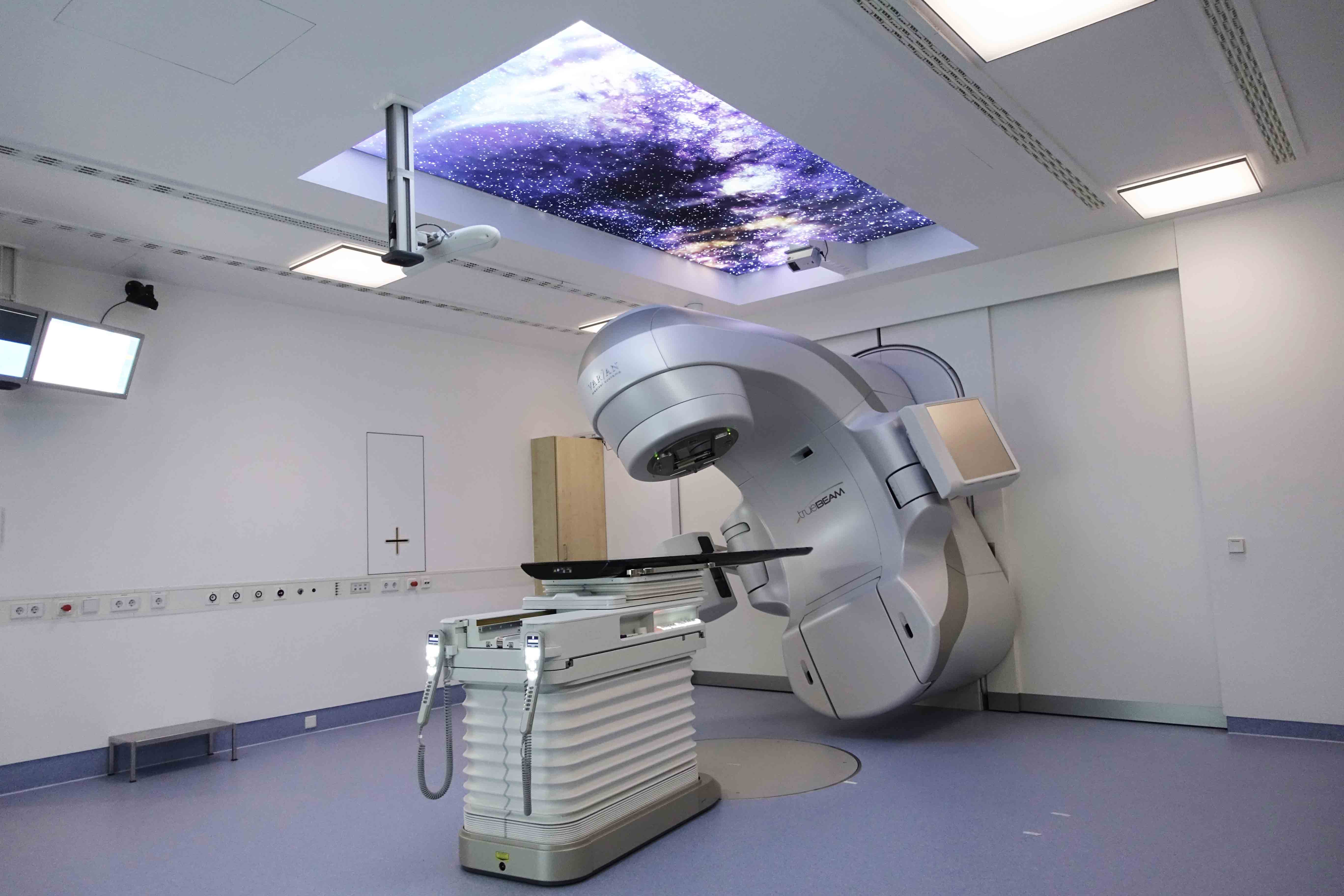 „Diese Hochpräzisionsbehandlung wird jetzt als Standard bei unseren Krebspatient*innen im Universitätsklinikum Ulm eingesetzt, wodurch der Erfolg der Strahlentherapie erhöht und die Häufigkeit unerwünschter Wirkungen reduziert werden kann“, sagt Professor Wiegel. Beim Einbau des neuen Linearbeschleunigers wurde auch der Behandlungsraum modernisiert. Eine individuelle Foto- und Lichtinstallation schafft eine angenehme und beruhigende Behandlungsatmosphäre. Ein zusätzliches Gesichtserkennungssystem unterstützt die Patientenidentifikation.