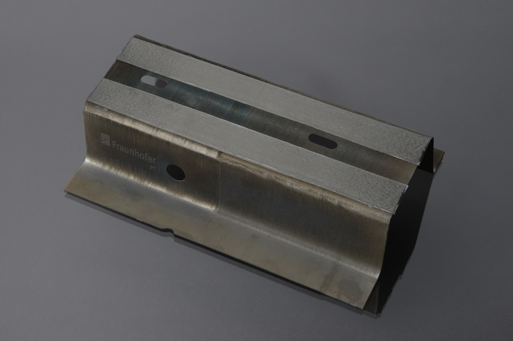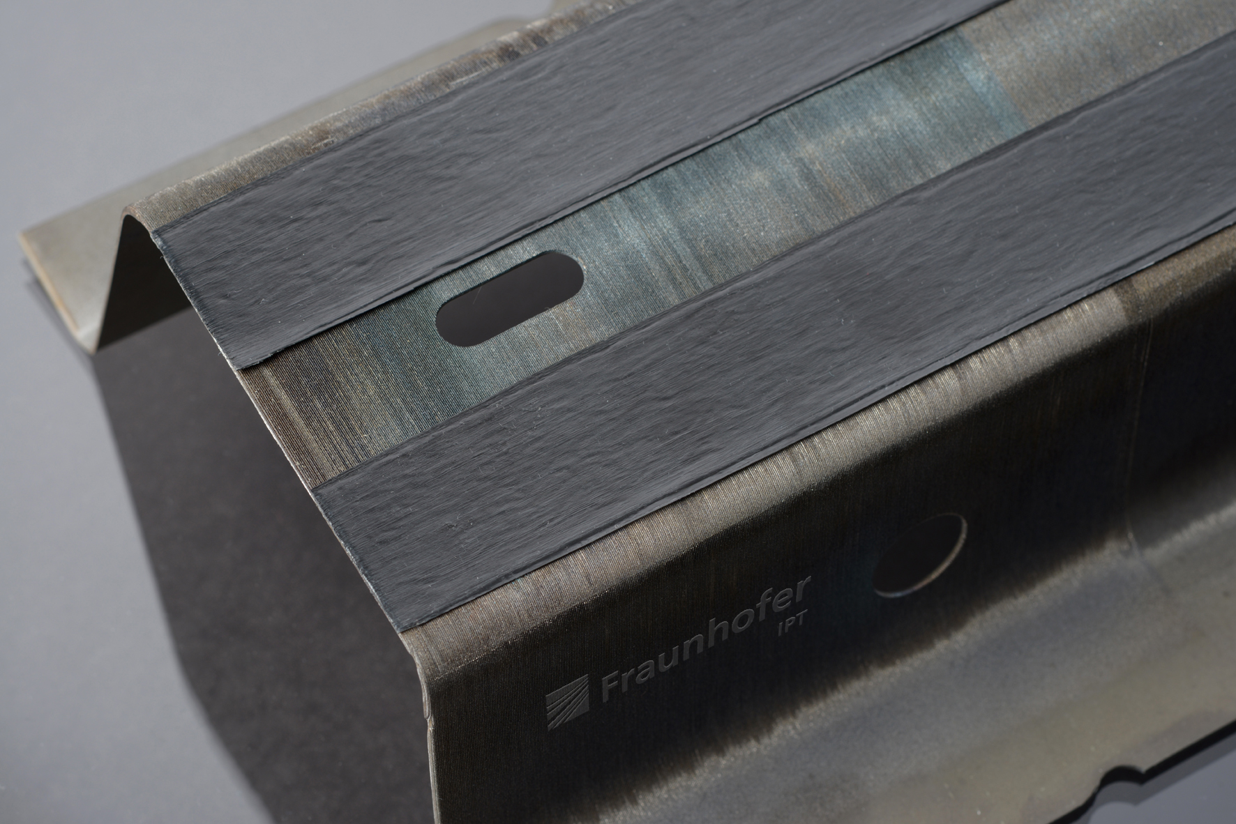 The research partners have now finished a first demonstrator component made of high-strength steel and unidirectional fiber-reinforced thermoplastic tape in order to validate the applicability of the process in the form of a proof-of-concept: The two Fraunhofer researchers Kira van der Straeten from the Fraunhofer ILT and Tido Peters from the Fraunhofer IPT manufactured a hybrid lightweight rocker panel, a body component for the automotive industry, to test and prove the functionality of the process combination as part of the ComMUnion project.