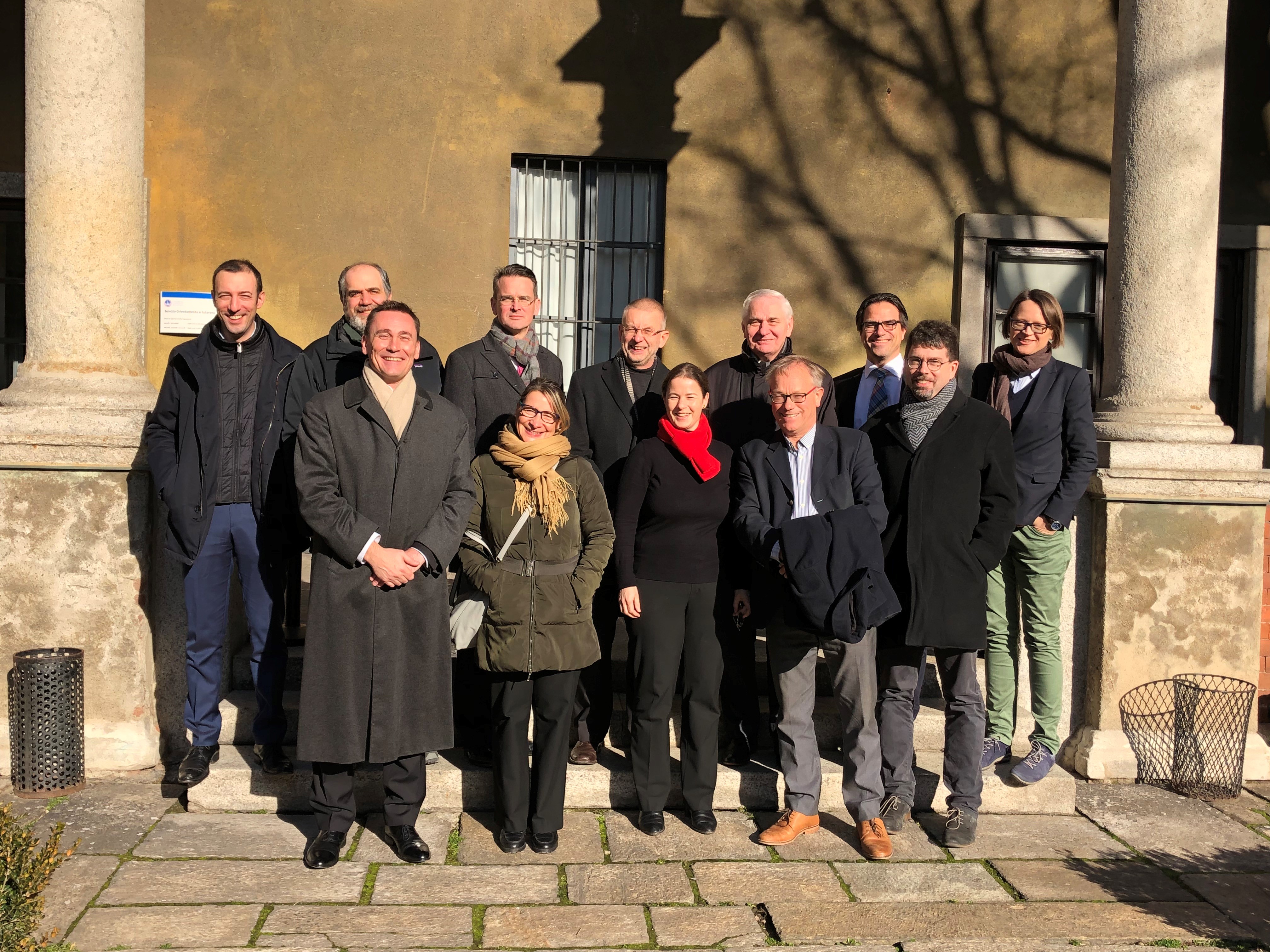 Bildtext: Vertreter der am Antrag beteiligten Hochschulen bei einem Treffen an der Università Cattolica im Februar. (Foto: Goethe-Universität)
