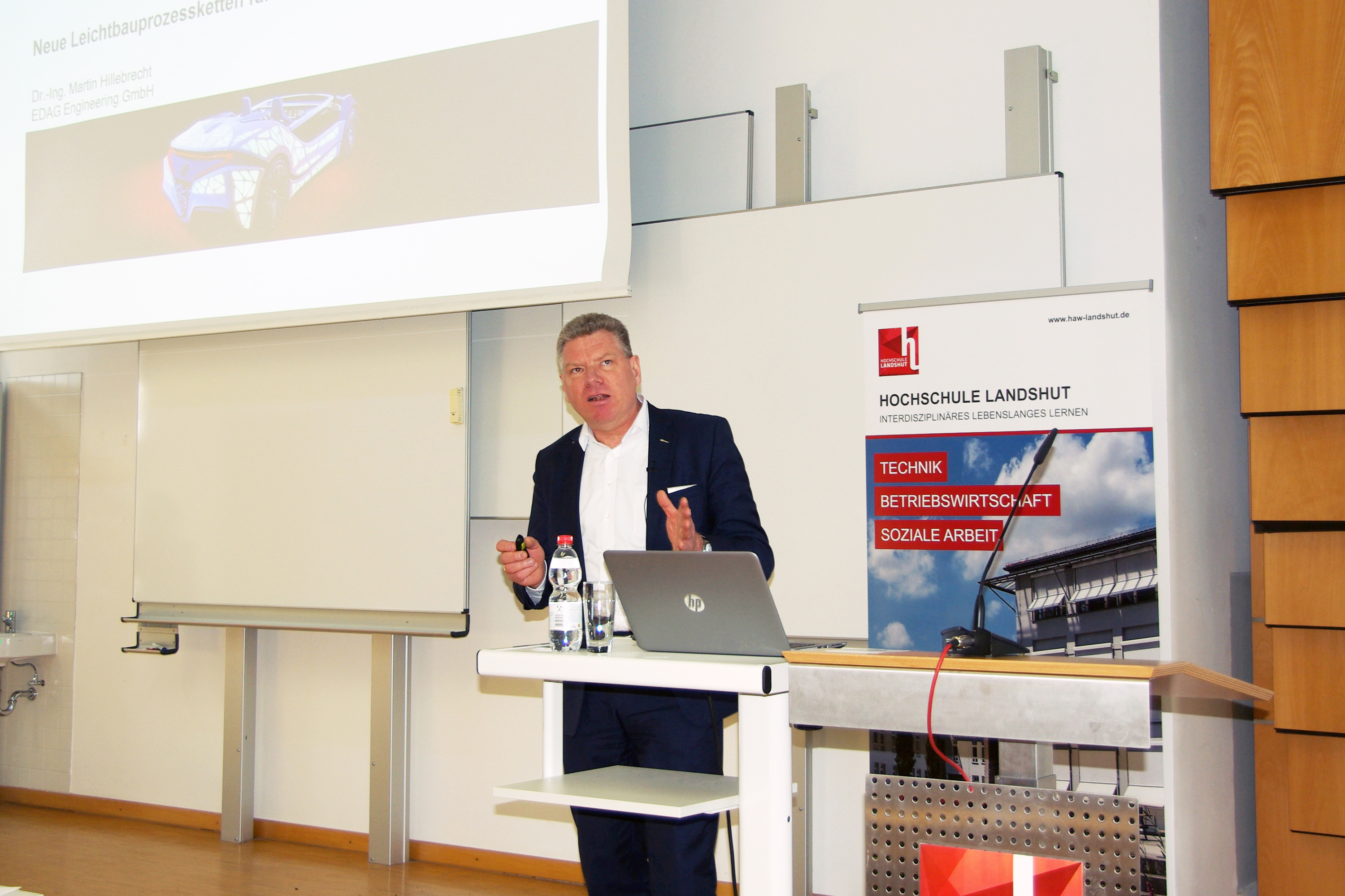 Zwei Keynotes von renommierten Leichtbau-Experten bildeten den Auftakt des Fachprogramms: Dr.-Ing. Martin Hillebrecht (Leiter Competence Center Leichtbau, Werkstoffe & Technologien, EDAG Engineering GmbH, Fulda) beleuchtete in seinem Vortrag „Neue Leichtbauprozessketten für das Fahrzeug von morgen" die Möglichkeiten und Herausforderungen an den Leichtbau entlang der gesamten Wertschöpfungskette. Die aktuellen Herausforderungen der Mobilität, wie E-Mobility, Digitalisierung und autonomes Fahren, seien auch „Gewichtstreiber“. So wiege das Batteriesystem bei einem Fahrzeug z.B. 540 Kilo, auch zusätzliche Sicherheitsansprüche müssten hier berücksichtigt werden. Leichtbau werde der strategische Hebel für die Weiterentwicklung des Automobils sein, ist er überzeugt. In verschiedenen Innovationsprojekten habe sein Unternehmen Fahrzeugkonzepte und Ansätze entwickelt, die von der Konstruktion und Produktion von Fahrzeugen bis zum Recycling reichen.