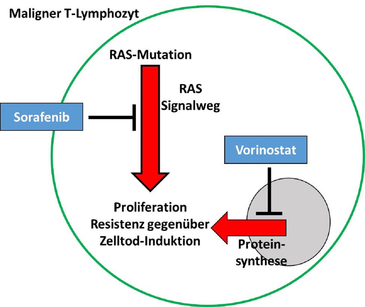 Die Abbildung zeigt eine schematische Darstellung eines malignen T-Lymphozyten des Sézary-Syndroms. Bei dieser Erkrankung sind verschiedene Wachstumsfaktoren (u. a. RAS) mutiert und führen somit zu einem beschleunigten Tumorwachstum und einer Therapieresistenz. Der Wirkstoff Sorafenib kann diesen Signalweg inhibieren und somit das Tumorwachstum verlangsamen und den Tumor für eine Therapie sensitivieren. Das allein reicht aber nicht aus. Vorinostat behindert die Proteinsynthese, indem das Ablesen der DNA erschwert wird. Das führt ebenfalls zu einer Verlangsamung des Tumorwachstums. Aber auch hier ist die Wirkung unzureichend. Kombiniert man beide Therapieoptionen, erhält man ein optimales Ansprechen der malignen Zellen. Massives Absterben der Tumorzellen ist zu beobachten. Daher bilden die Daten ein vielversprechendes Fundament für die Entwicklung neuer Tumortherapien.