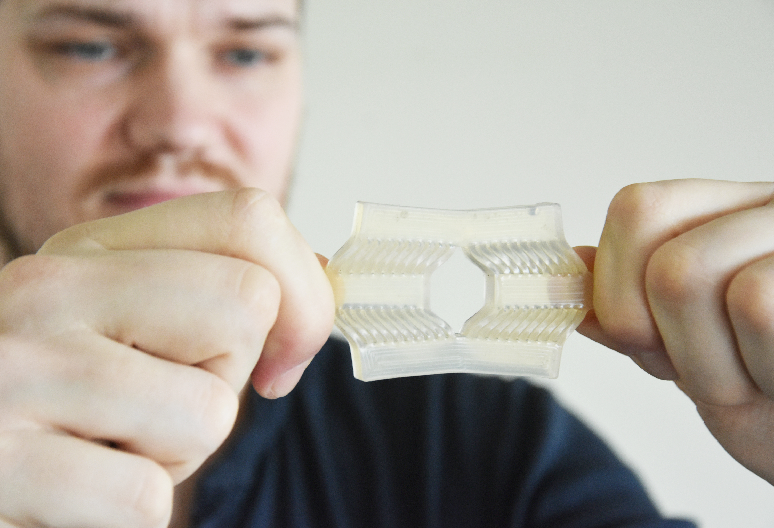 Timmermanns langfristiges Ziel ist es, eine Software zu entwickeln, die für jede Einsatzmöglichkeit dehnungsversteifender Materialien die passende Kombination aus Ausgangsmaterial und geometrischer Struktur ermittelt. Das Ergebnis könnte per 3D-Druckverfahren passgenau hergestellt werden. „Zunächst bin ich aber auf der Suche nach Kooperationspartnern aus dem Bereich Orthopädie und Industrie, um gemeinsam eine Orthese zu entwickeln, die den Tragekomfort bei Patientinnen und Patienten erhöht“, so der Materialwissenschaftler. Auch an Industriepartnern für Soft-Robotik-Anwendungen ist er interessiert. Ein Patent für das Material hat er bereits erteilt bekommen.