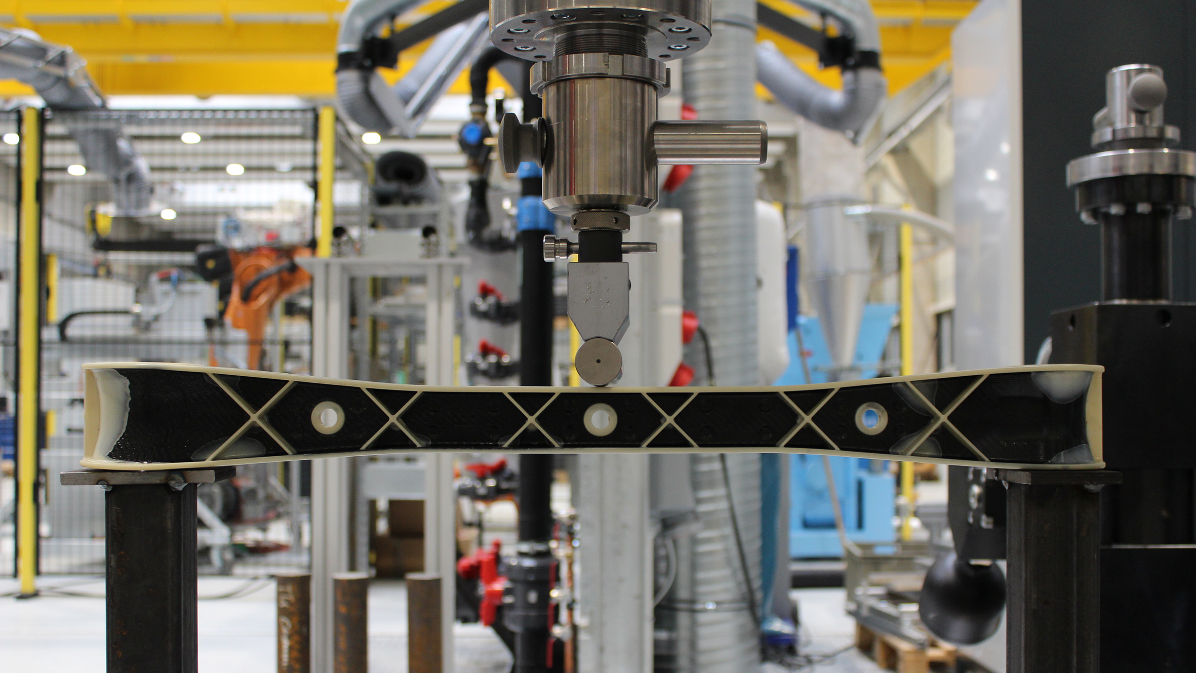 „Ein wesentlicher Fokus des Forschungsprojekts war die Wirtschaftlichkeit der Herstellung – ein Faktor, der von den Beteiligten durch die Entwicklung einer durchgängigen Prozesskette gewährleistet werden konnte“, erklärt Vogel. Dafür fusionierten sie bislang getrennte Fertigungsschritte zu einem zeit- und materialeffizienten Ganzen: So beginnt der neue Prozess mit dem Zusammenfügen des aus mehreren thermoplastischen FKV-Lagen bestehenden Ausgangsmaterials und dessen thermischer Umformung. Danach legt ein Laser eine kleine Tasche für den Sensor im entstehenden Bauteil frei. Der Sensor in Form eines Dehnungsmessstreifens (DMS) wird anschließend in einem automatisierten Prozess eingebracht. Er kann mechanische Größen in eine messbare Änderung des elektrischen Widerstands umwandeln und so entsprechende Belastungen anzeigen. Die Bauteilfertigung wird abgeschlossen, indem die Sensortasche wieder versiegelt und Verstärkungsstrukturen zur Stabilisierung des Oberrohrs per Spritzgießverfahren angefügt werden. Im Anschluss daran wird noch ein intelligenter Beschleunigungssensor zur Ermittlung der Stoßbeschleunigung auf den Funktionsdemonstrator appliziert.