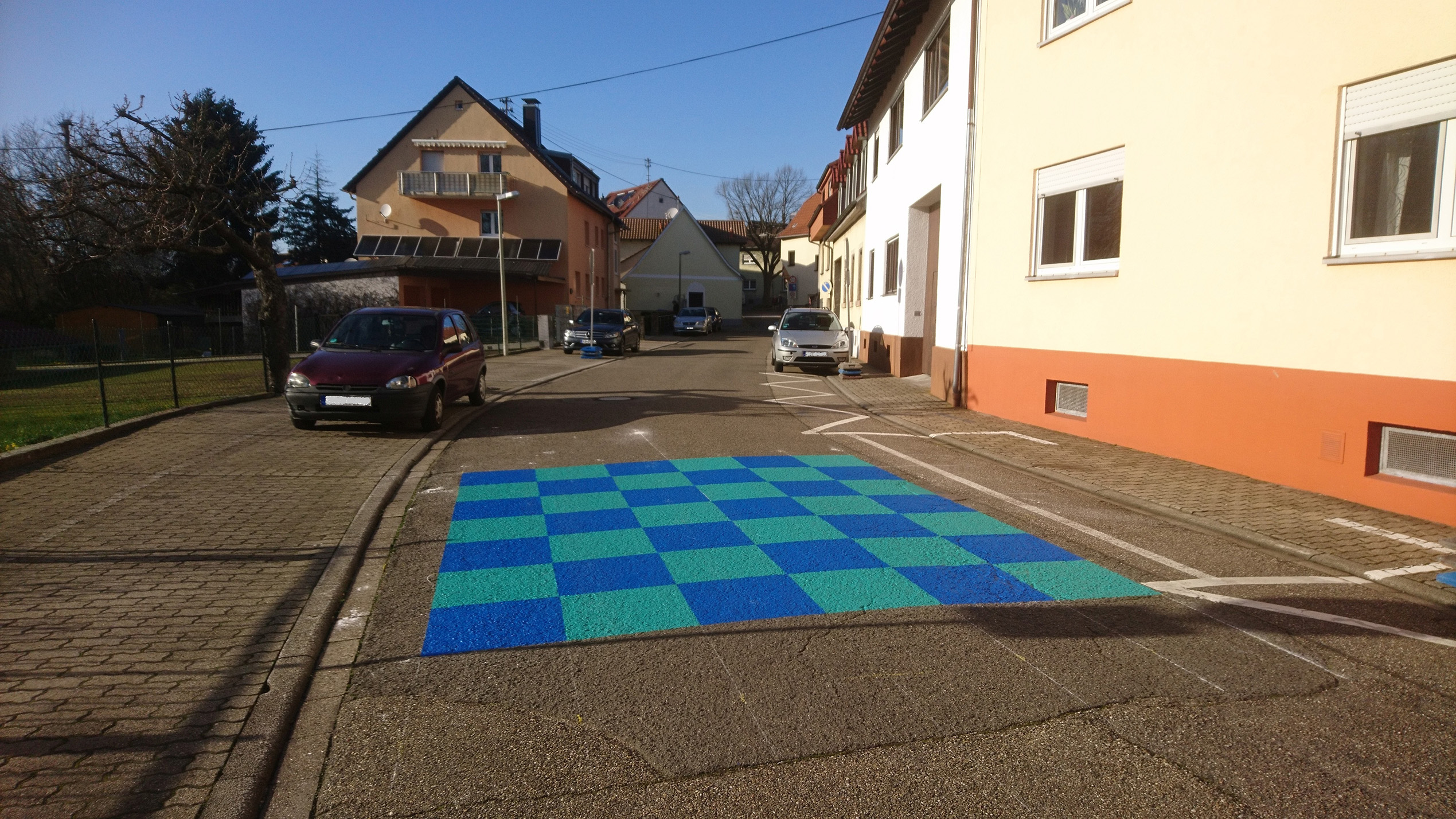Vor rund zwei Jahren wurden die Gehwege in der Litzelaustraße im Stadtteil Knielingen weitgehend aufgegeben und damit die Parkierungsflächen an die Straßenränder verlagert. Seither nutzen Fußgänger sowie Rad- und Autofahrer den inneren Straßenraum gemeinsam. Daher kommt es in diesen Bereichen besonders auf eine Gestaltung an, die sich vom „normalen“ Straßenraum abhebt und so zu gegenseitiger Rücksichtnahme der Verkehrsteilnehmer beiträgt. Um den Effekt der gemeinsamen Nutzung zu verstärken, wurden hierfür am 19. März dieses Jahres insgesamt vier unterschiedlich gestaltete Farbfelder in Blau und Grün angebracht. Zusätzlich wurde die Straße am Anfang und am Ende mit blauen Querbalken und Piktogrammen mit Fußgänger-, Fahrrad- und Autosymbol versehen, die einfahrende Verkehrsteilnehmer auf die veränderte Verkehrssituation aufmerksam machen sollen. Die Anordnung der Piktogramme in Dreiecksform soll deutlich machen, dass sich alle Verkehrsarten diese Fläche teilen.