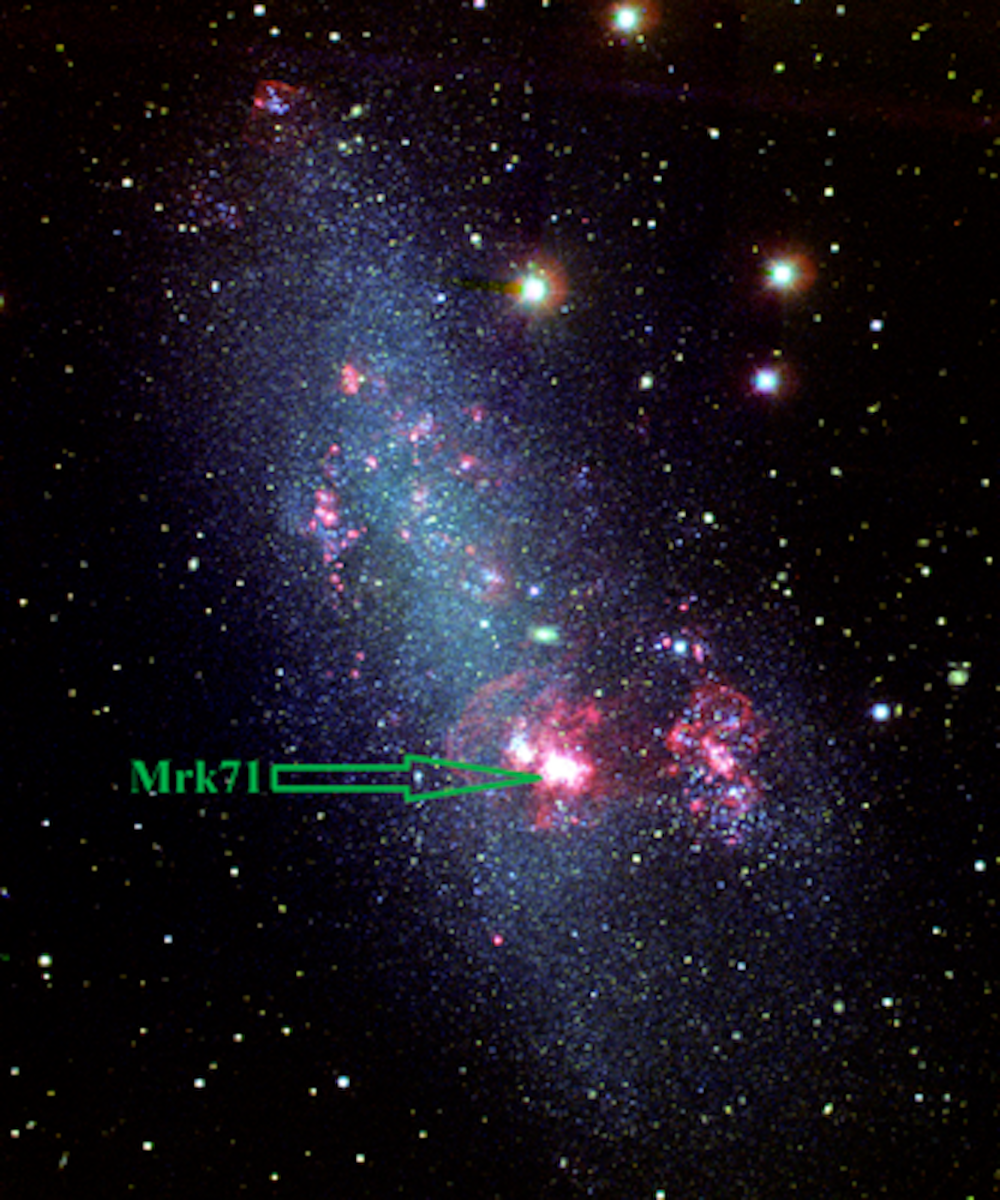Die der Erde nächste „Green Pea“-Galaxie ist NGC 2366, eine Zwerggalaxie mit unregelmäßigem Aussehen, die der Großen Magellanschen Wolke ähnelt. Mit nur 11 Millionen Lichtjahren Entfernung ist NGC 2366 nah genug, um sie im Detail untersuchen zu können. In ihrem südlichen Gebiet liegt Mrk 71, ein riesiger Nebel und zwei Ansammlungen junger, heißer Sterne, die das Gas (größtenteils Wasserstoff) um sie herum erleuchten. Solche großen nebelartigen Komplexe sind ein Ort aktiver und anhaltender Entstehung von Sternen.