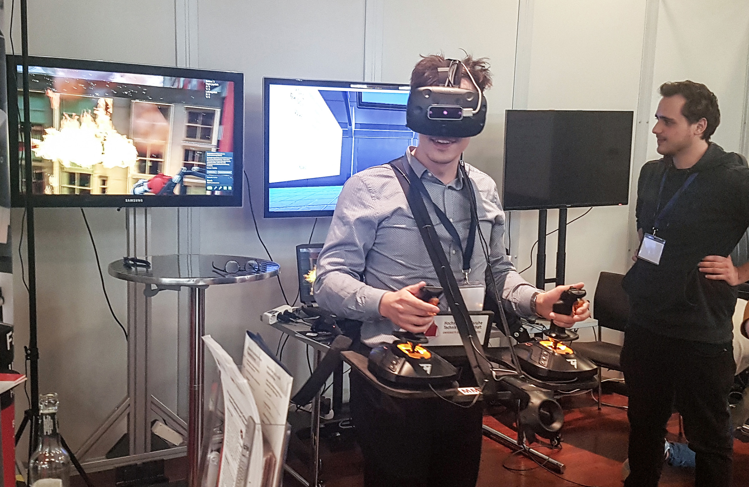Virtual Reality (VR), also das Erleben einer künstlichen Realität mittels einer speziellen Brille, gehört zu den Schlüsseltechnologien der Digitalisierung. Bei der VHS-Veranstaltung „Business Thementag 2019: Augmented & Virtual Reality“ am 20. März 2019 in Esslingen zeigten Tim Kurz, Maschinenbaustudent an der Hochschule Karlsruhe – Technik und Wirtschaft, sowie seine Kommilitonen aus der Mechatronik Florian Gundermann, Johannes Hiltensberger und Philipp Ruffing, wie Löschfahrzeuge mittels VR-Technologie effektiver gefertigt und bedient werden können. Die angehenden Ingenieure führten dabei ihre Anwendungen live vor und berichteten dem Publikum über ihre Erfahrungen bei der Entwicklung im industriellen Bereich.