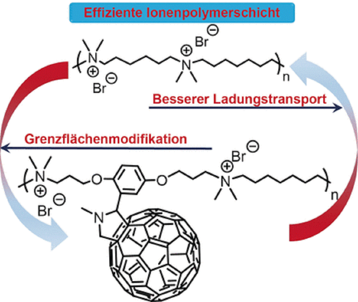 Das Fulleren-Ionenpolymer entwickelten die Wissenschaftler durch ein Stufenwachstumsverfahren unter Verwendung von neuartigen funktionalen Monomeren. Dann bauten sie es als Zwischenschicht in eine organische Photozelle ein, deren Wirkungsgrad sich um beeindruckende 300 Prozent steigerte und zweistellige Werte von über 10% erreichte. Ein solcher Wirkungsgrad liegt im üblichen Anwendungsbereich von Photozellen. Eine relativ einfache Materialinnovation kann also den Wirkungsgrad verbessern. Die Autoren betonen, dass hier insbesondere die Unverträglichkeit zwischen (harter) Elektrode und (weicher) aktiven Schicht überbrückt wurde.